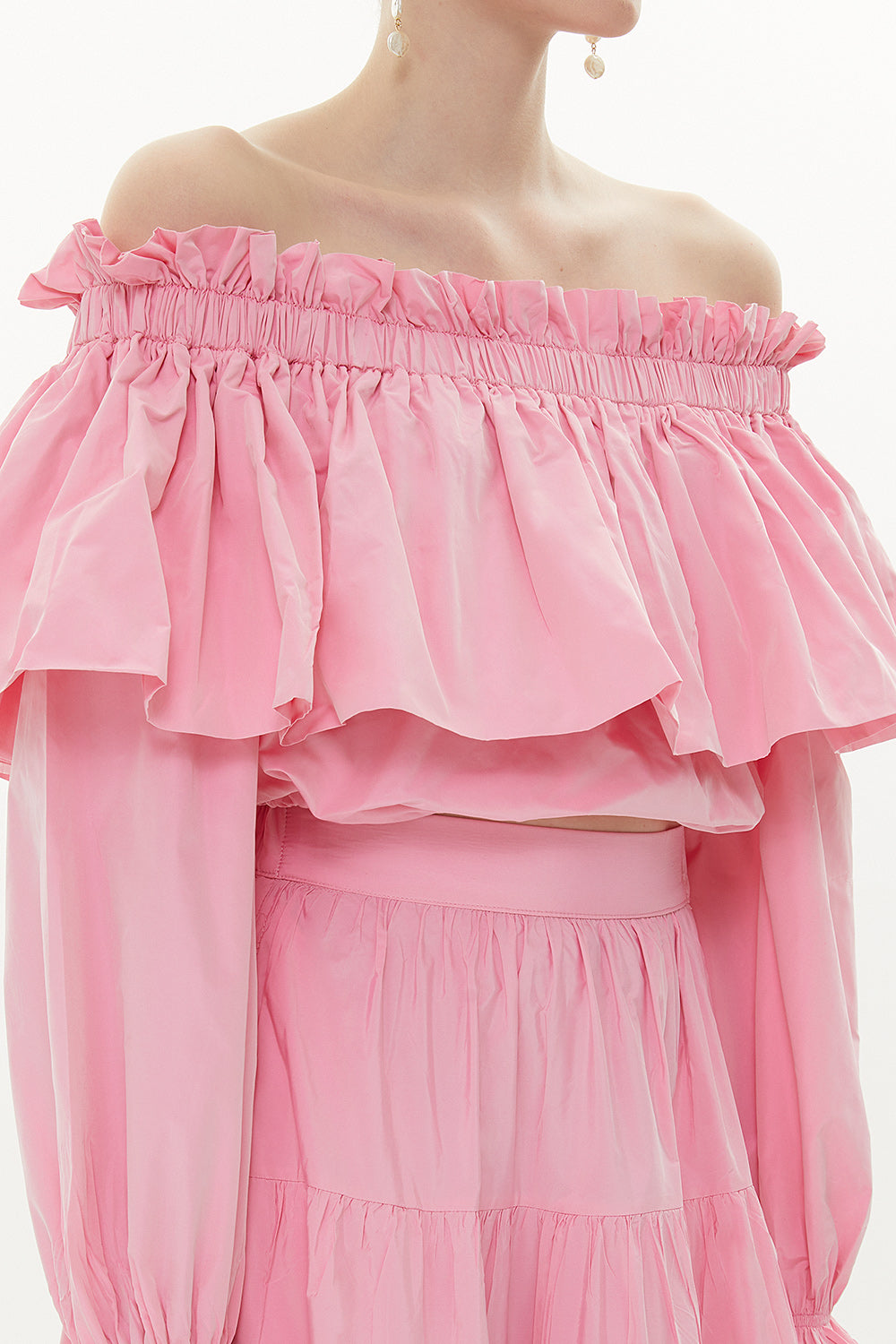 Açık Pembe Omuz lastikli balon kol crop bluz 19821