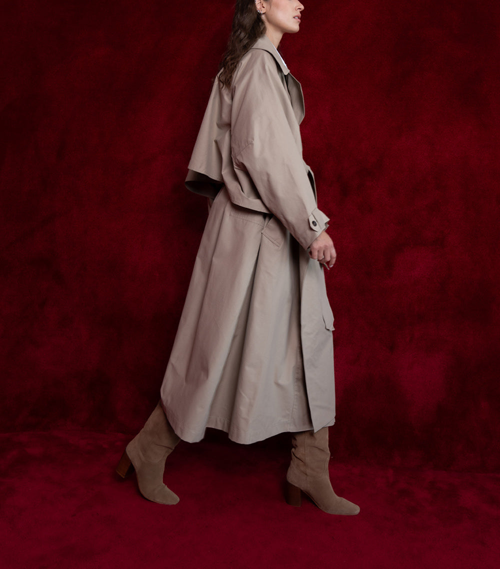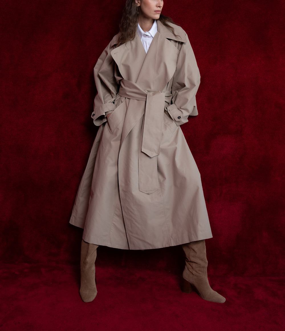 Ürün Özellikleri: Geniş yakası ve belden bağlamalı kuşağıyla güçlü bir siluet sunan bu trençkot, modern ve zamansız bir şıklık yaratır. Rahat kesimiyle katmanlı kombinler için ideal bir dış giyim parçasıdır.