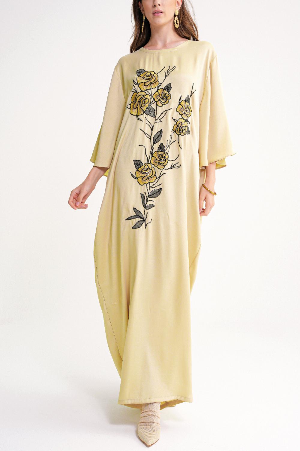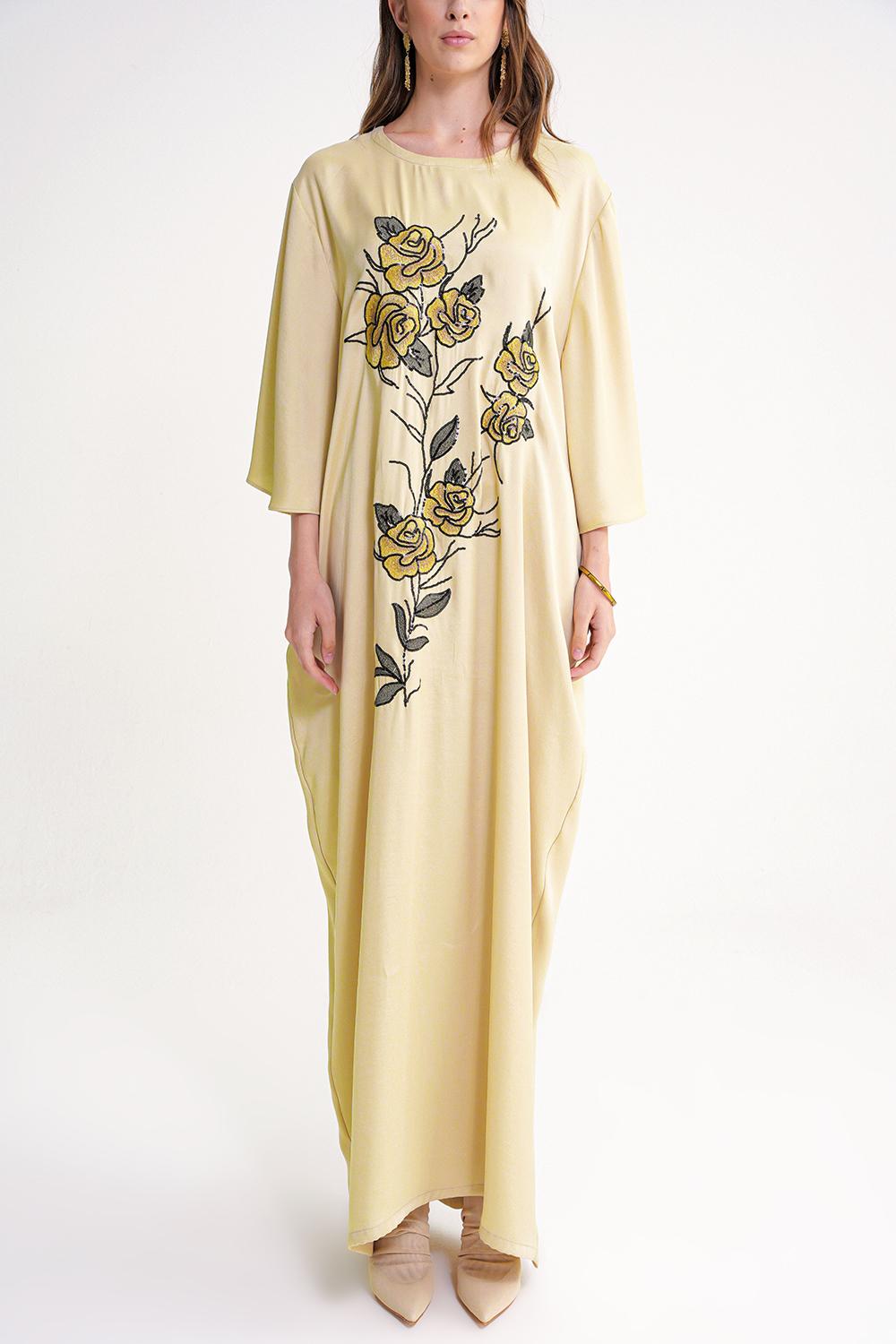Bej Nakış detaylı bol kesim uzun elbise 94648