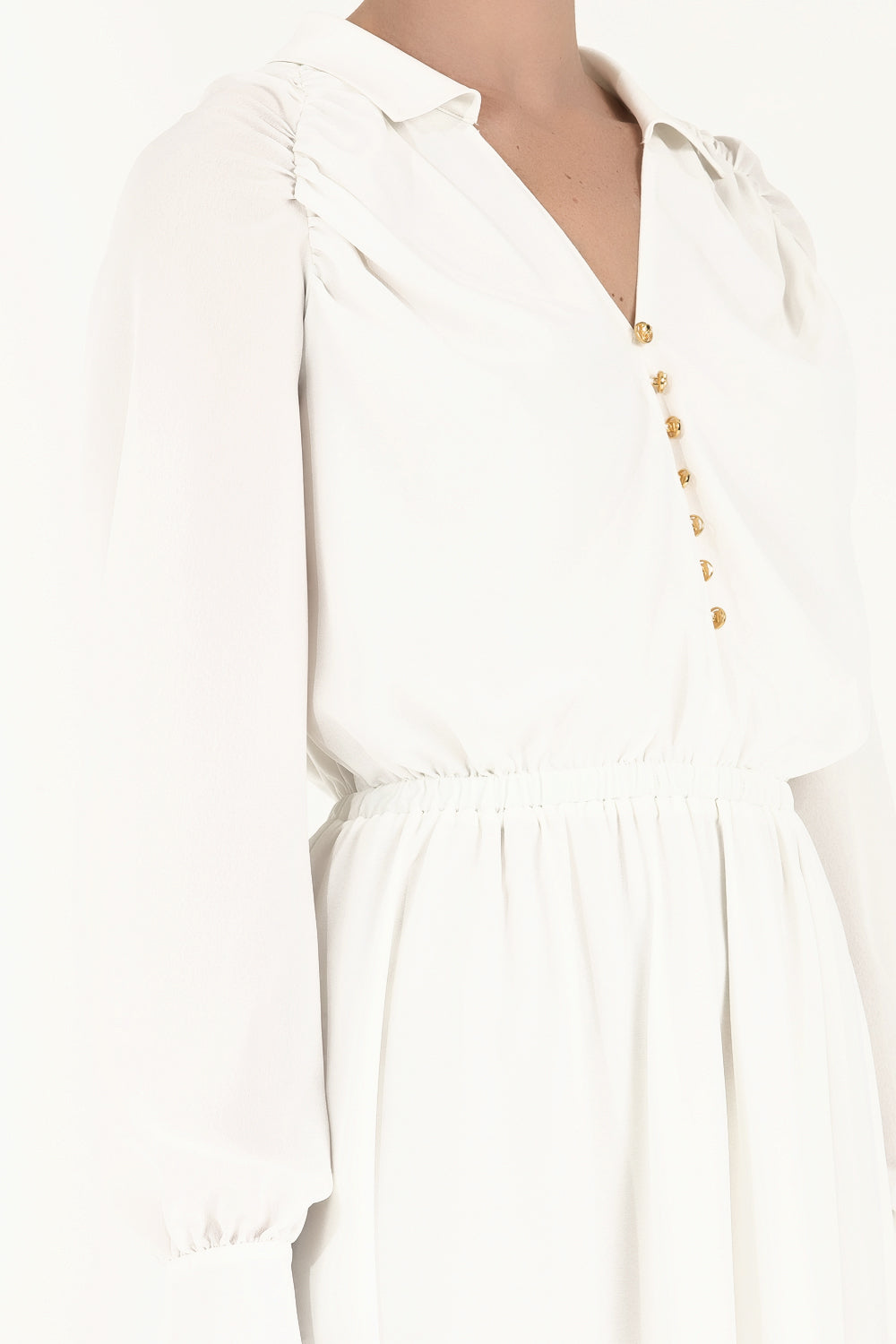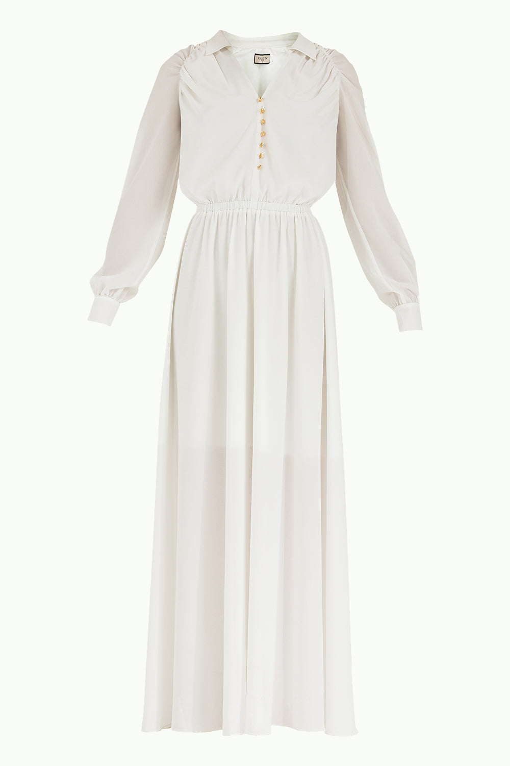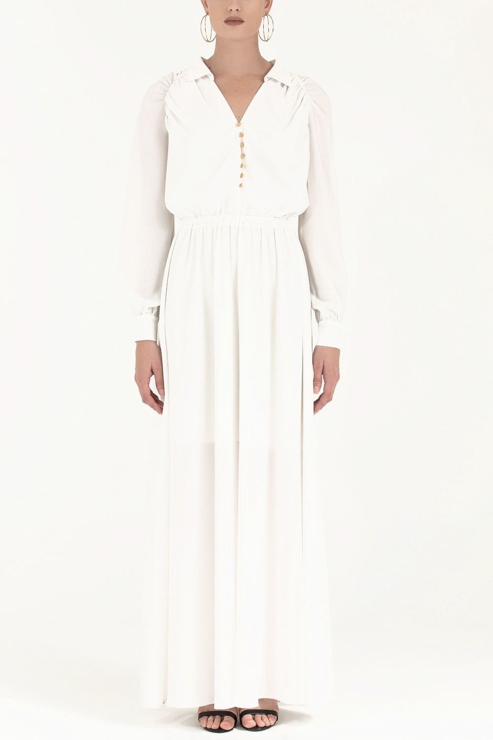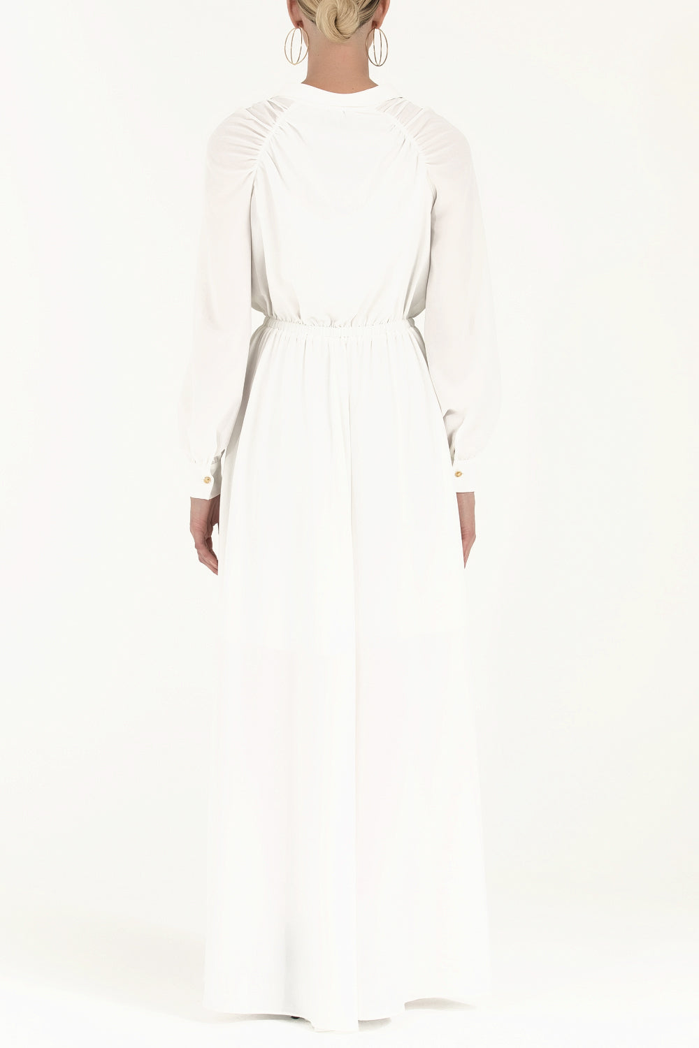 Beyaz Omuzları büzgülü düğmeli uzun elbise 92251