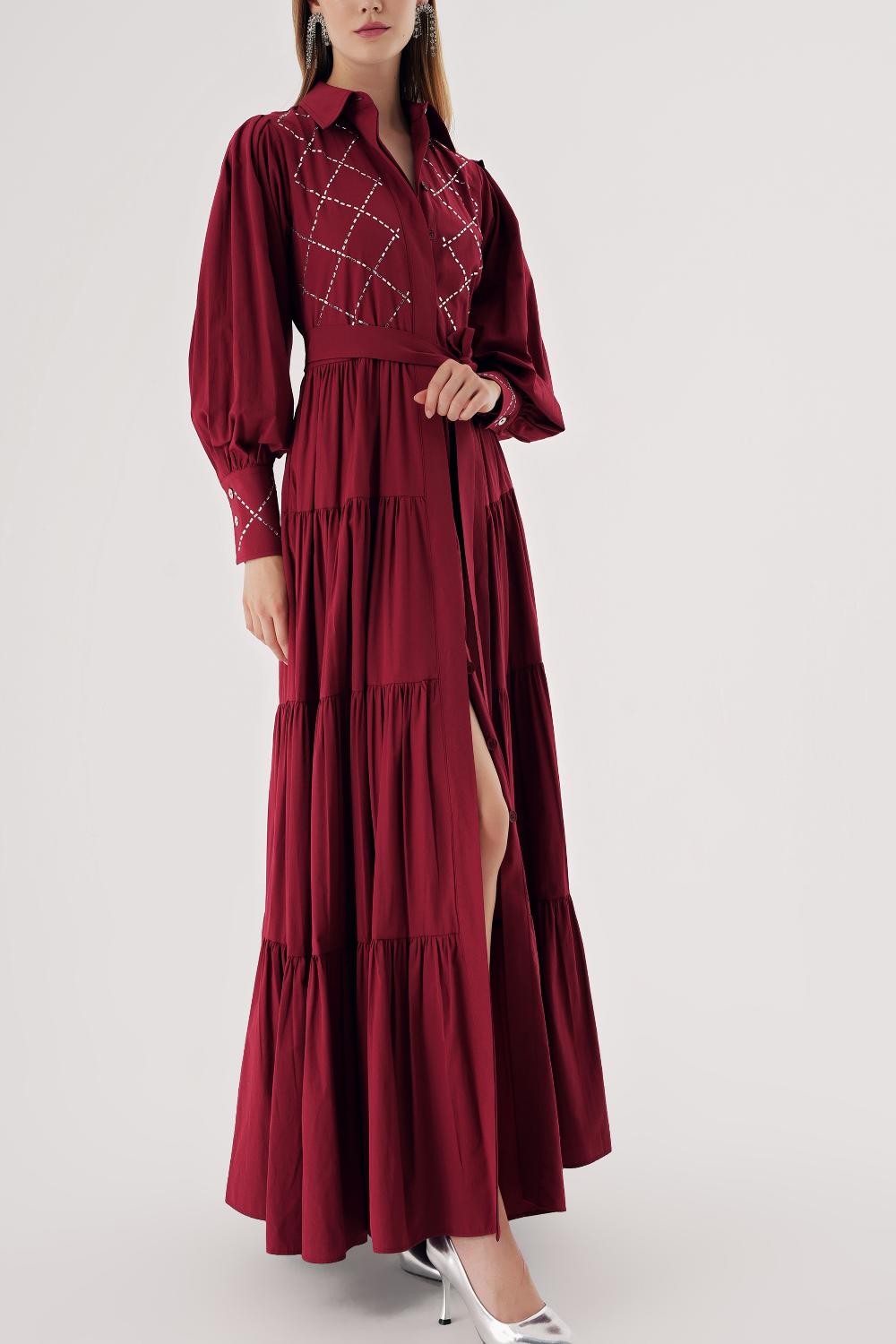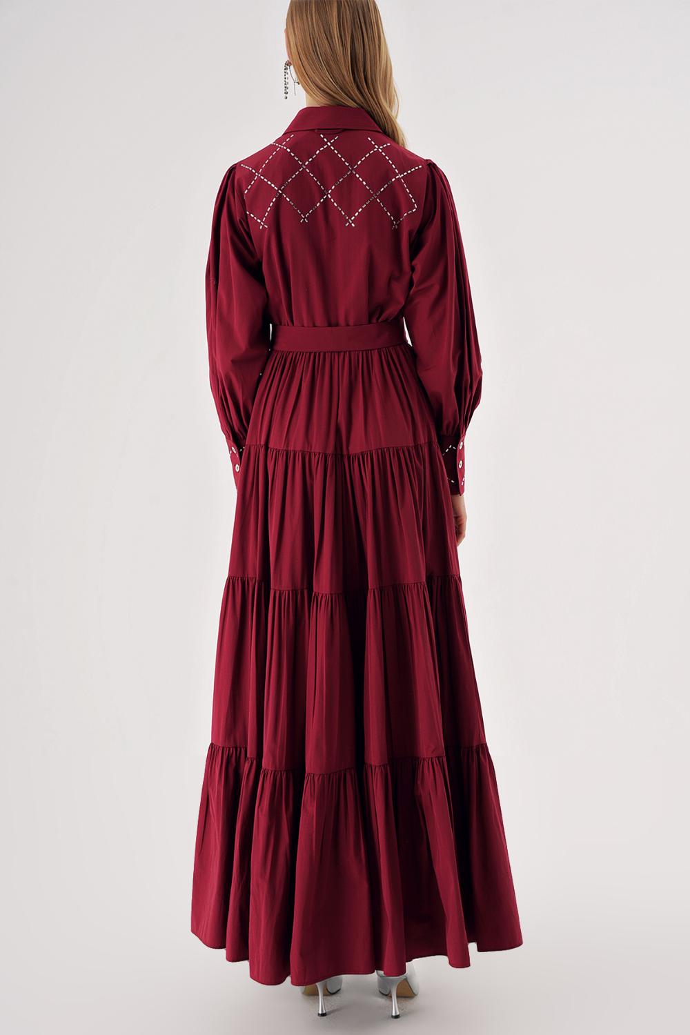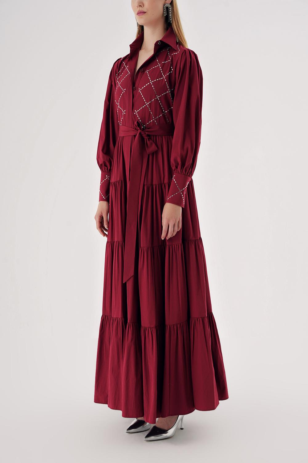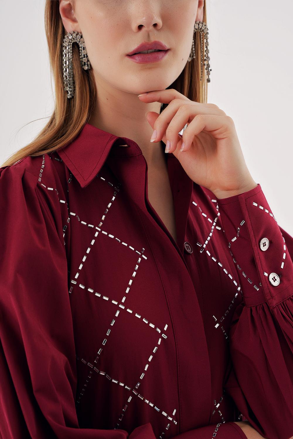 Bordo Balon kol büzgülü kristal taş detaylı gömlek elbise 94546