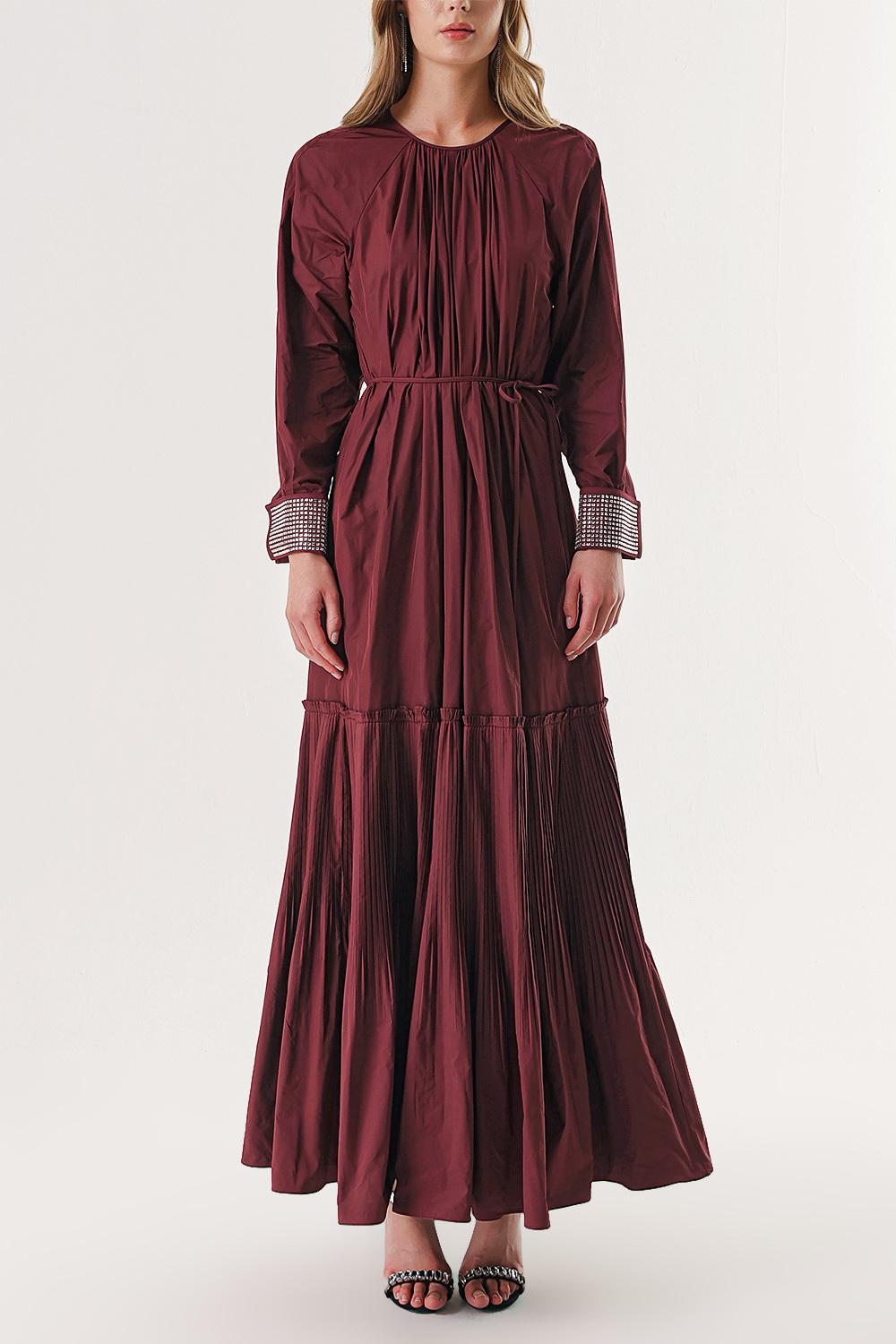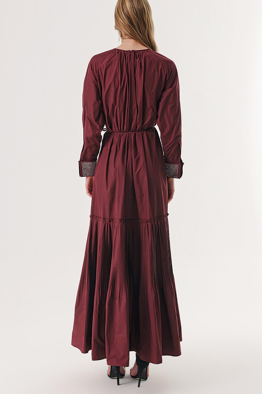 Bordo Pilise detaylı manşeti kristal taşlı bol kesim elbise 94310