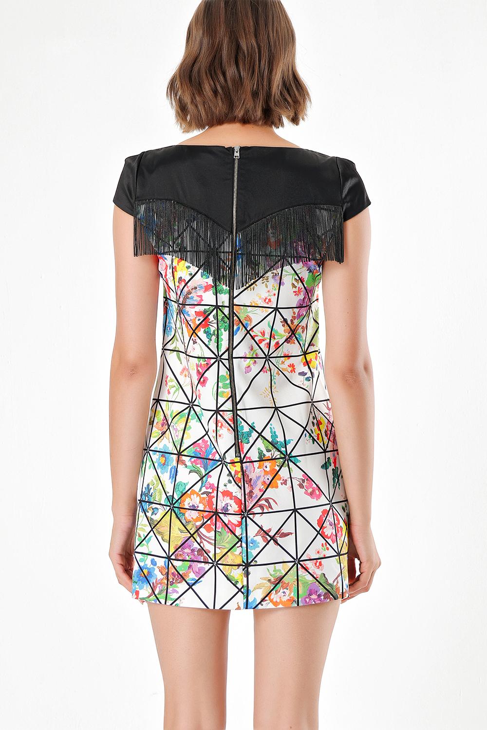 Çiçekler Ve Geometrik PÜSKÜL DETAYLI DESENLİ ELBİSE 91568