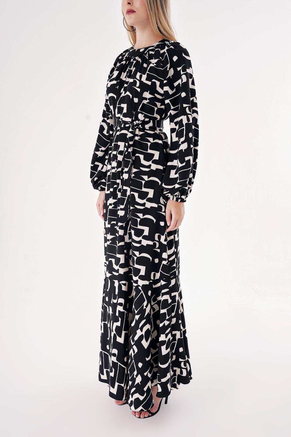 Desenli Bol büzgülü balon kollu kemerli elbise 94481