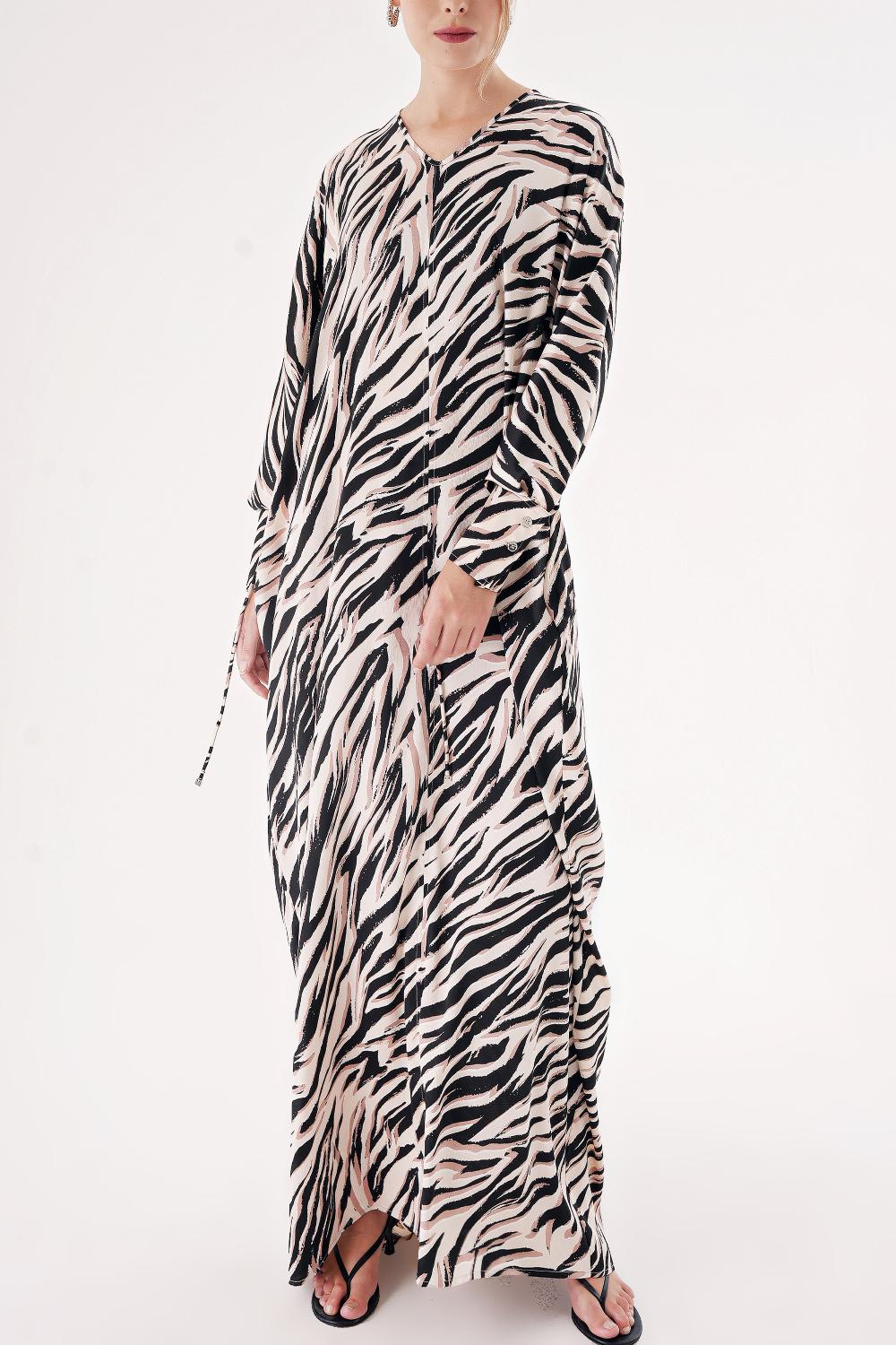 Desenli Bol kesim kemerli uzun elbise 94417