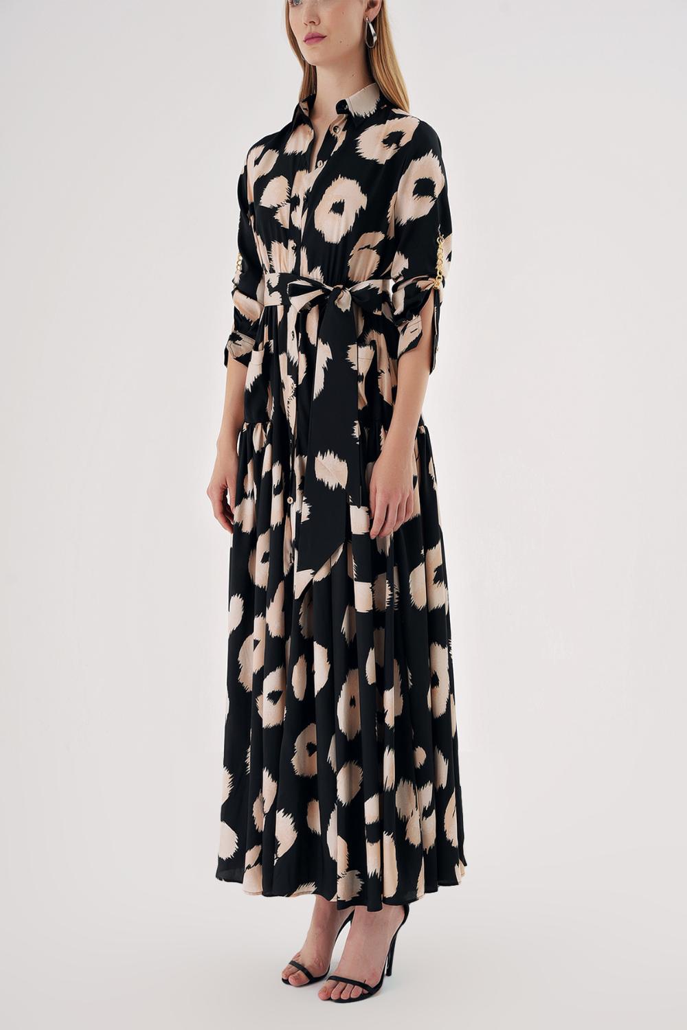 Desenli Büzgülü zincir aksesuar detaylı uzun gömlek elbise 94568