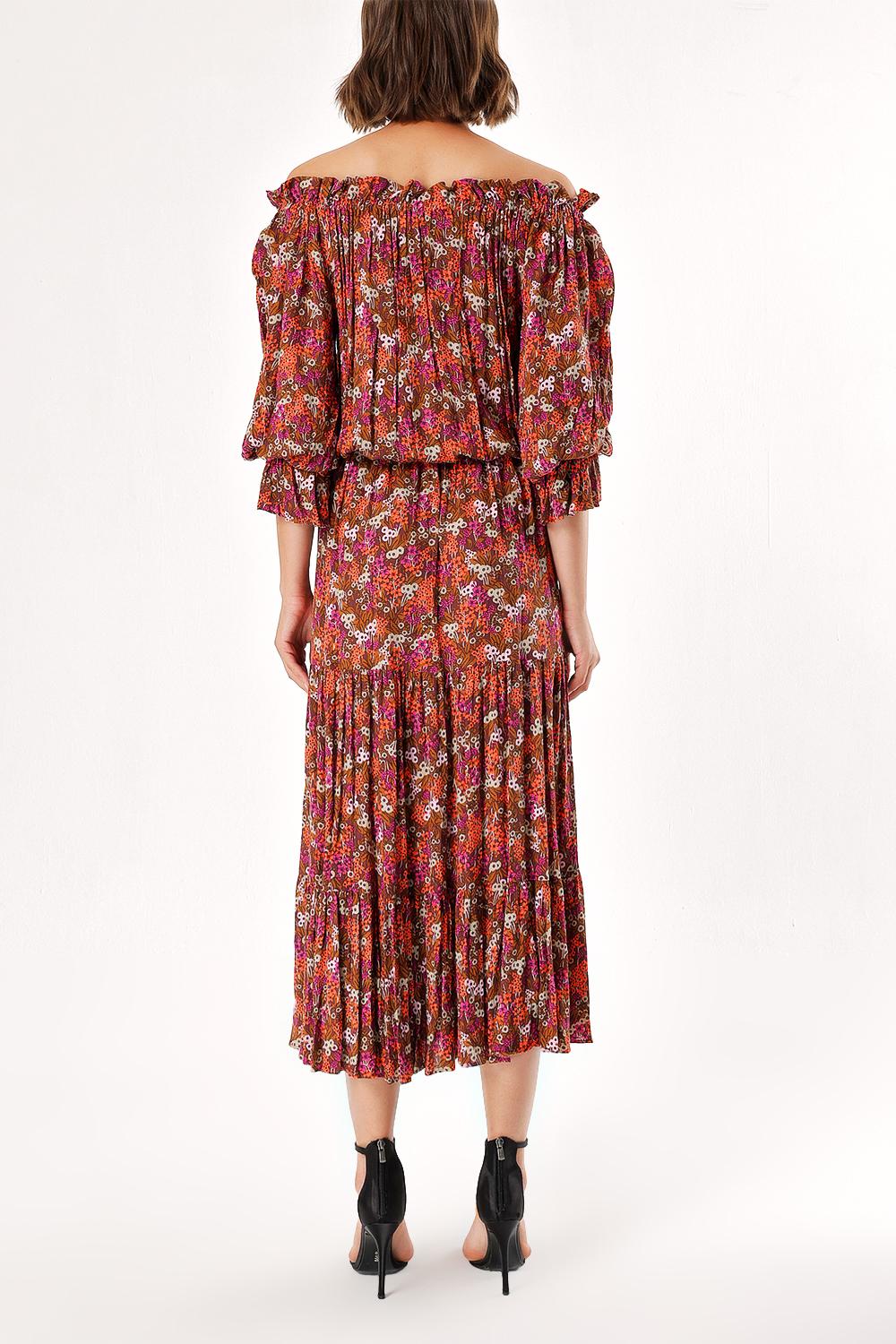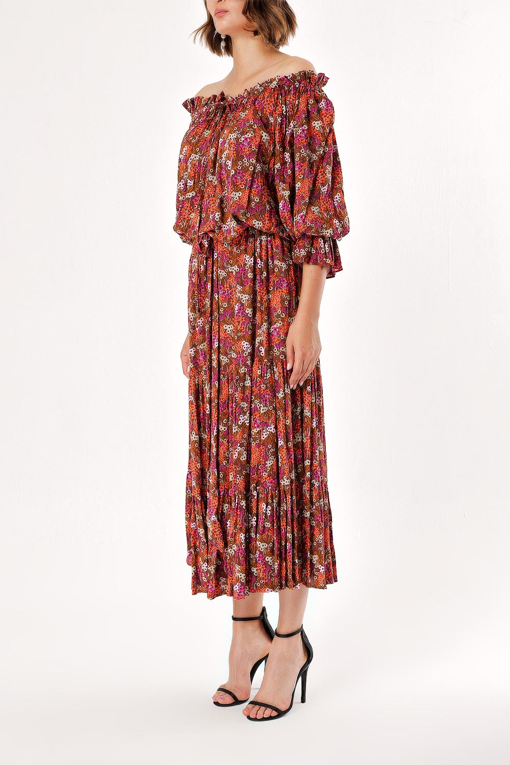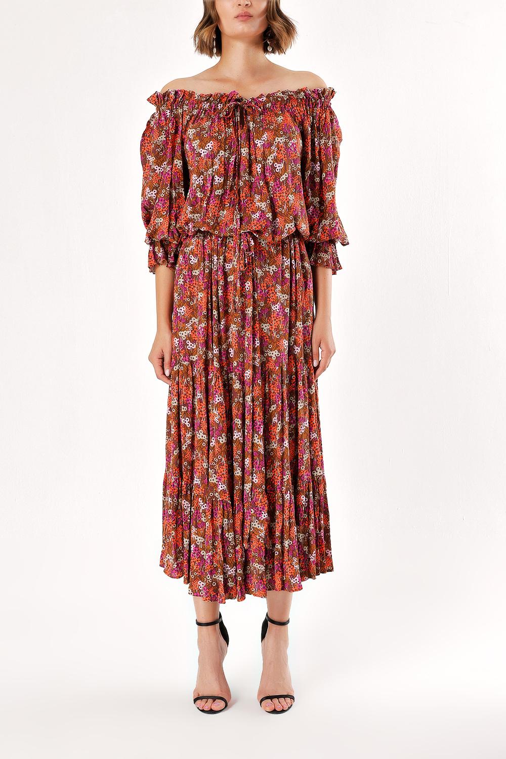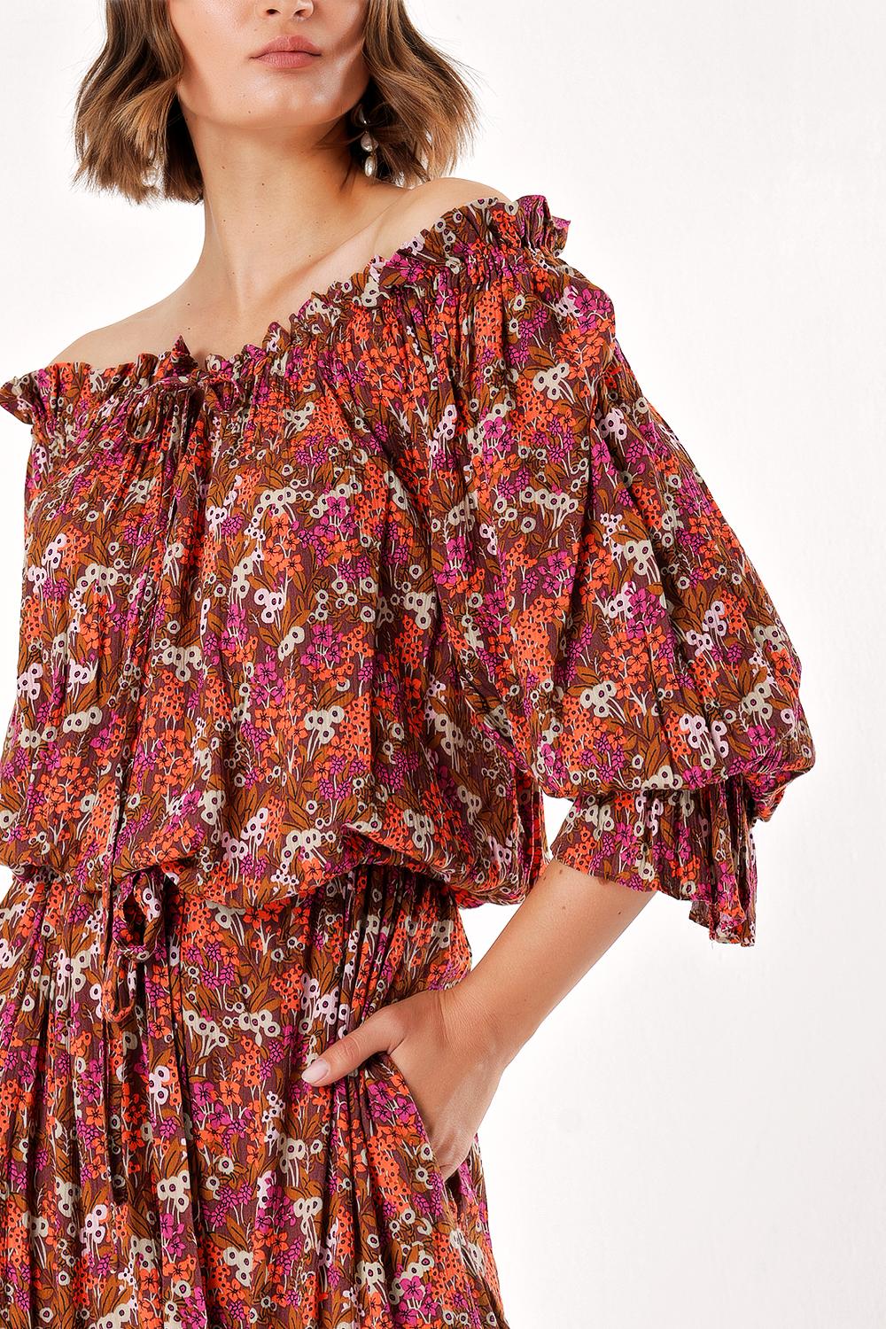 Desenli Düşük omuzlu fırfırlı elbise 93465