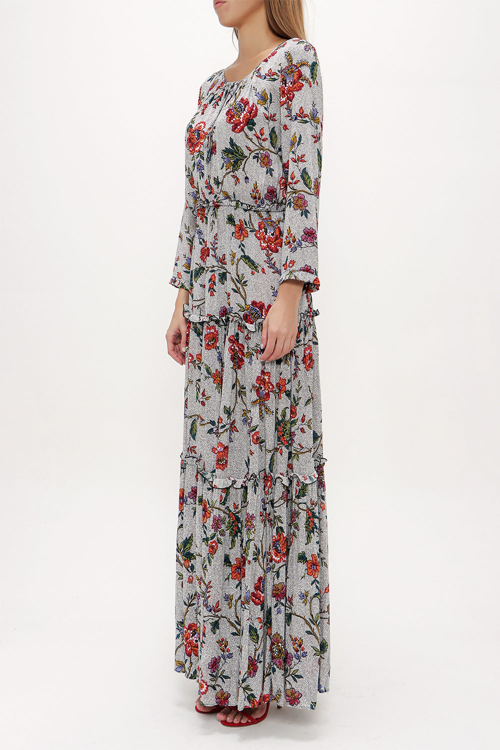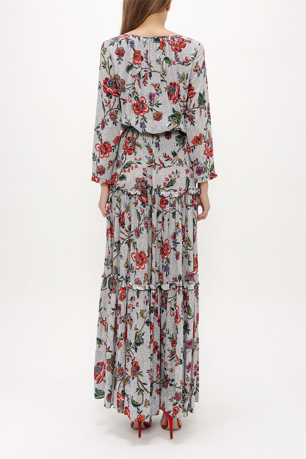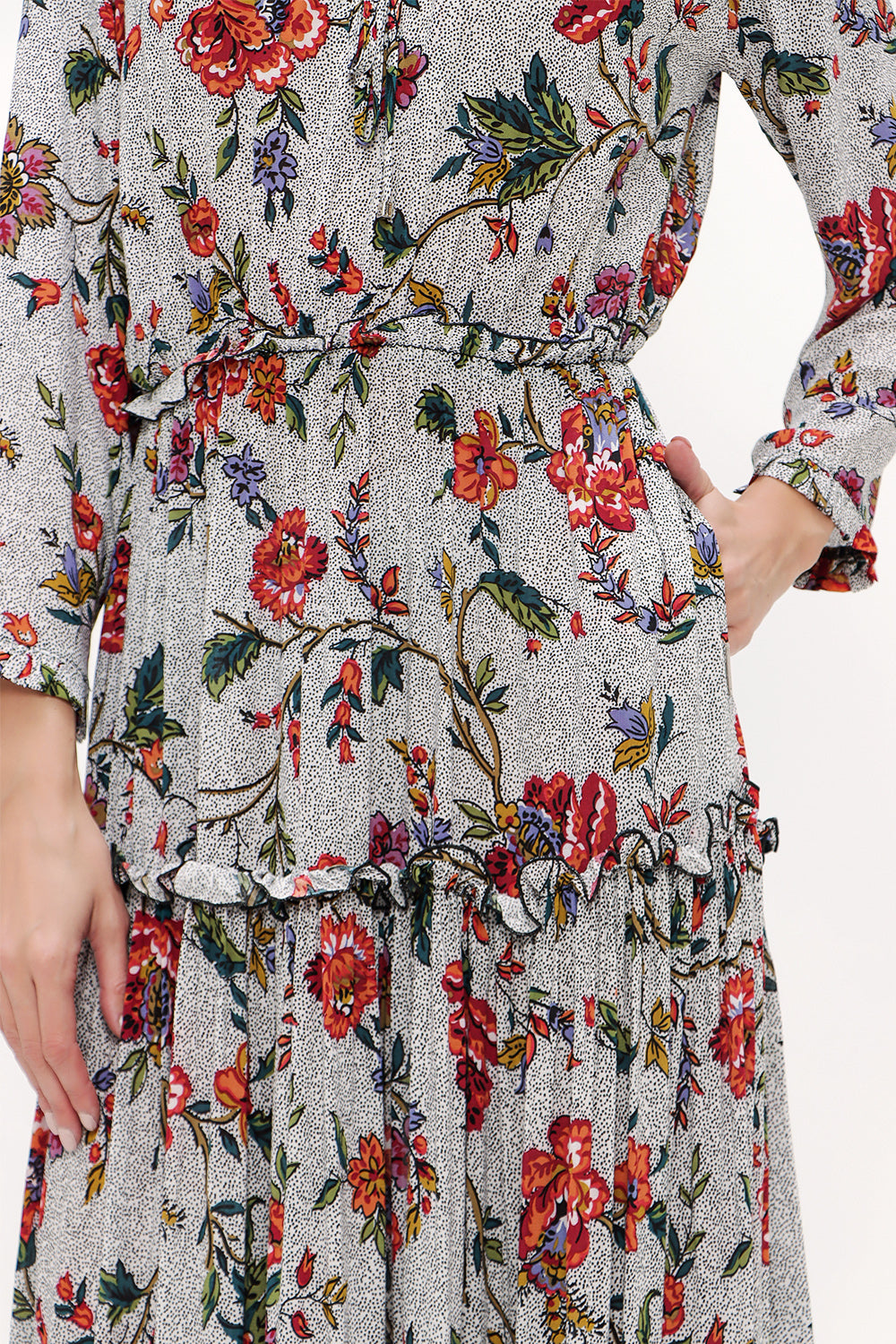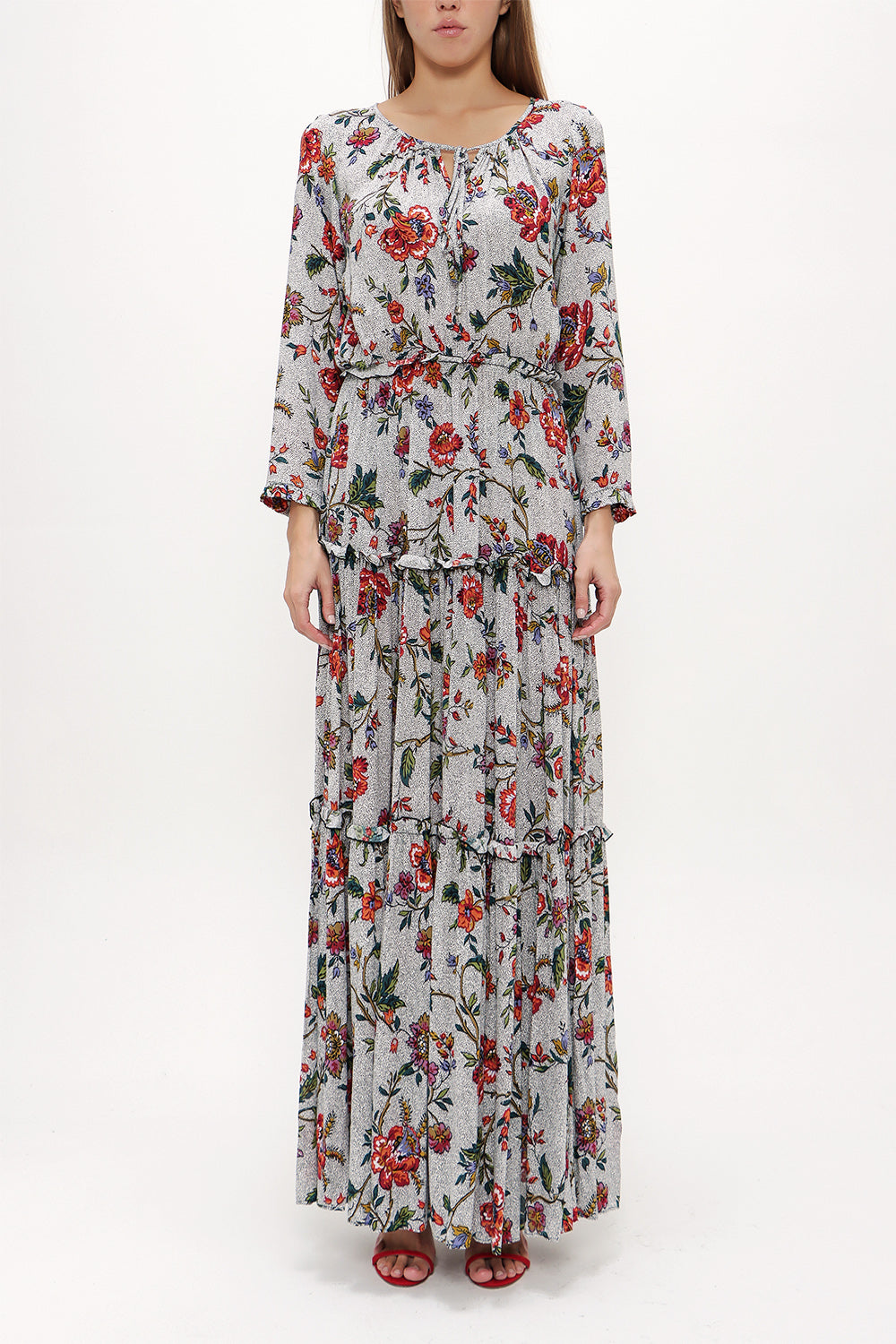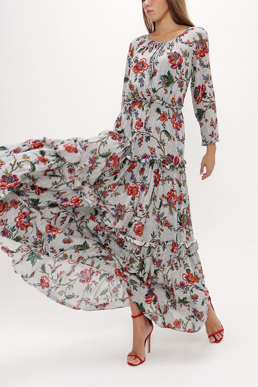 Desenli Yakası bağcıklı fırfırlı uzun elbise 93146