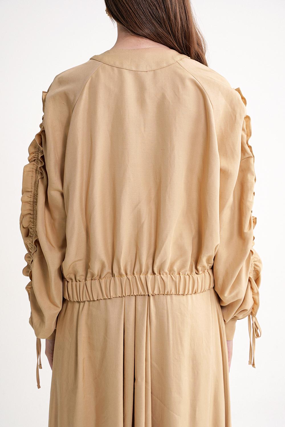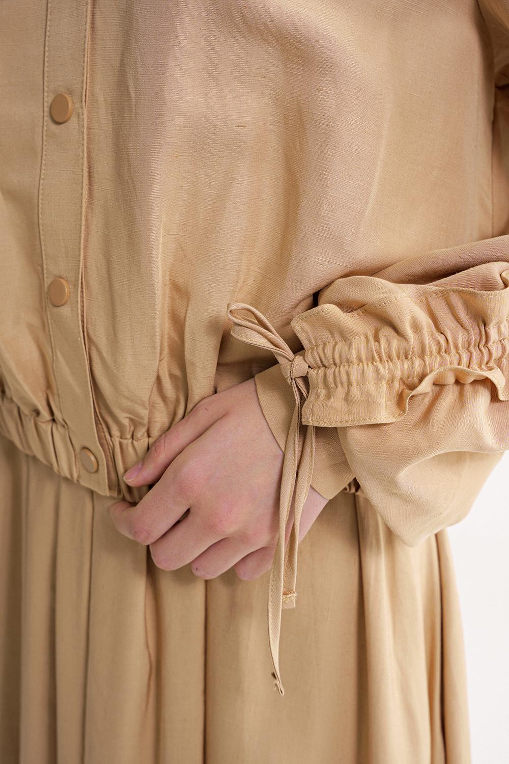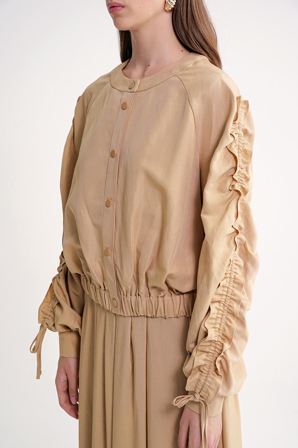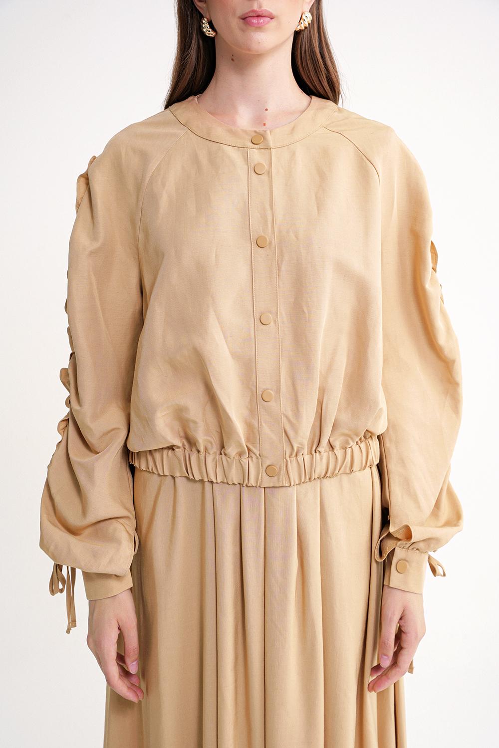 Ürün Özellikleri: Büzgülü kolları ve bağcık detaylarıyla öne çıkan bu ceket, modern ve feminen bir duruş sağlar.Keten kumaşı ve çıtçıt düğme sayesinde gün boyu konfor sağlar.
