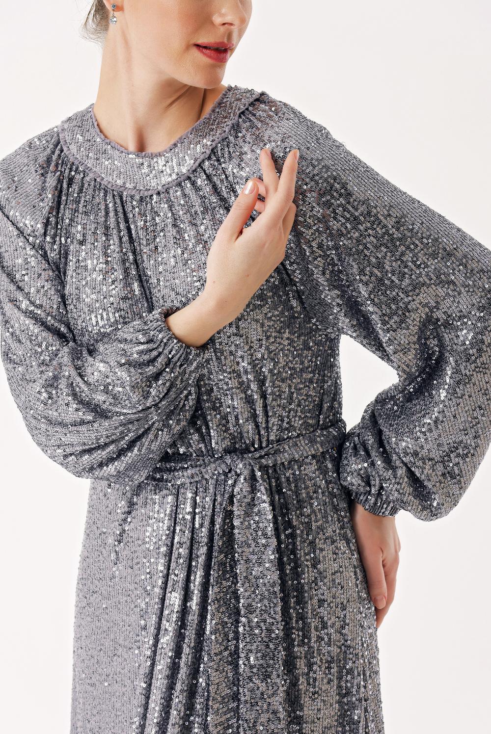 Gümüş Büzgü detaylı balon kollu payetli elbise 94468