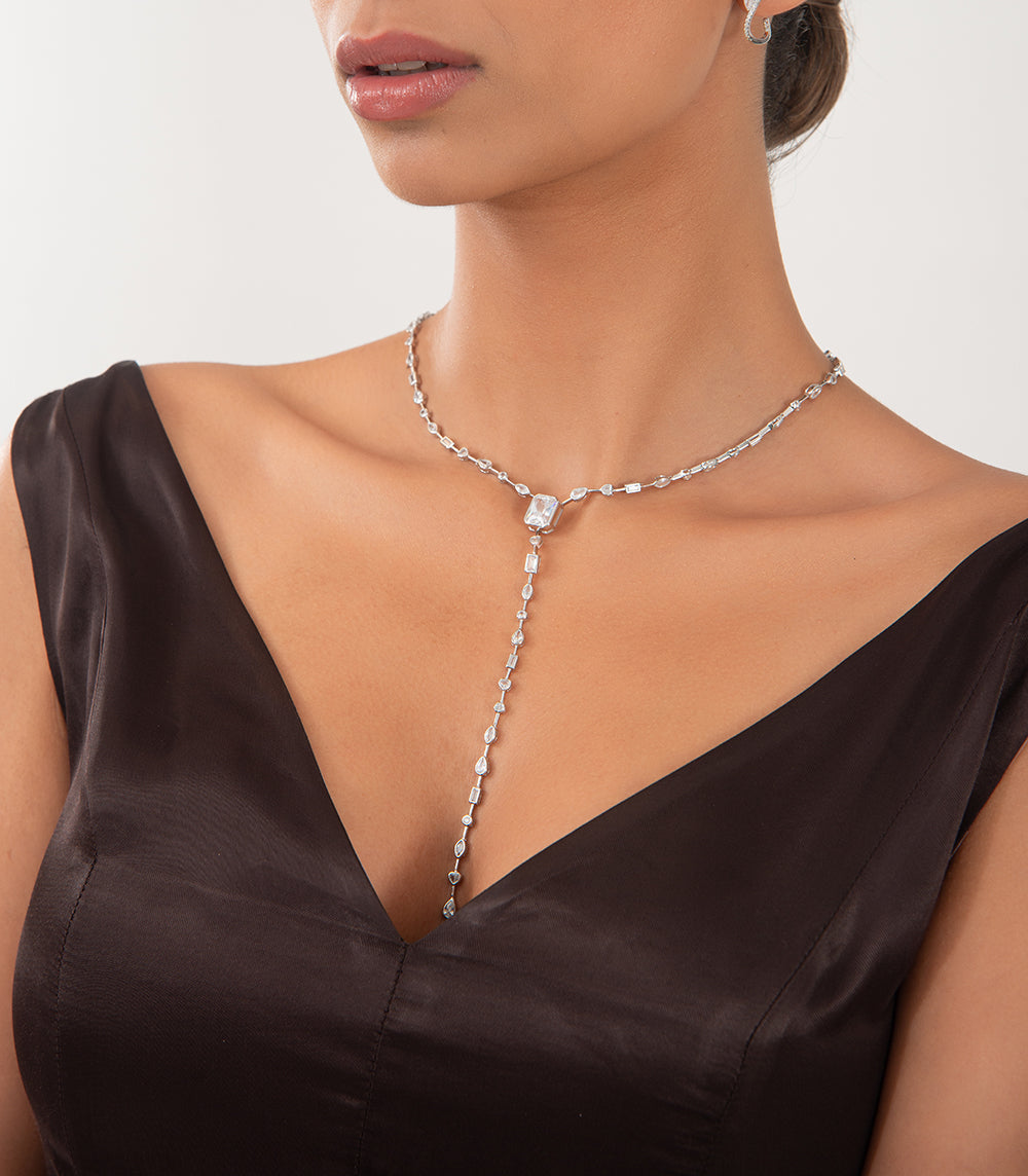 Gümüş Uzun Y formunda kristal taş detaylı 925 ayar gümüş kolye 168