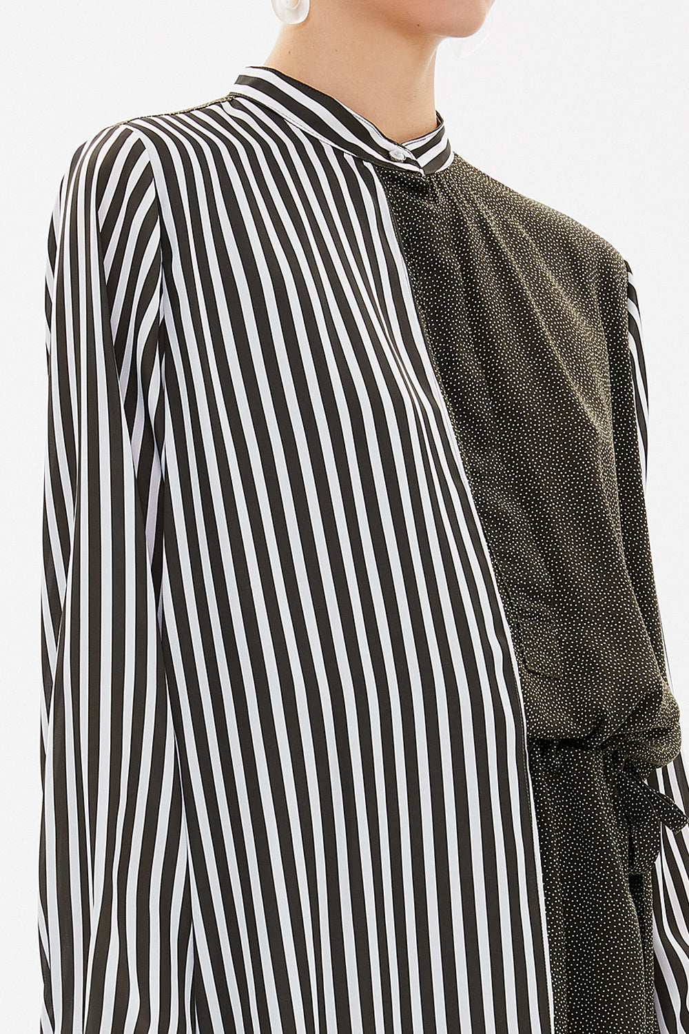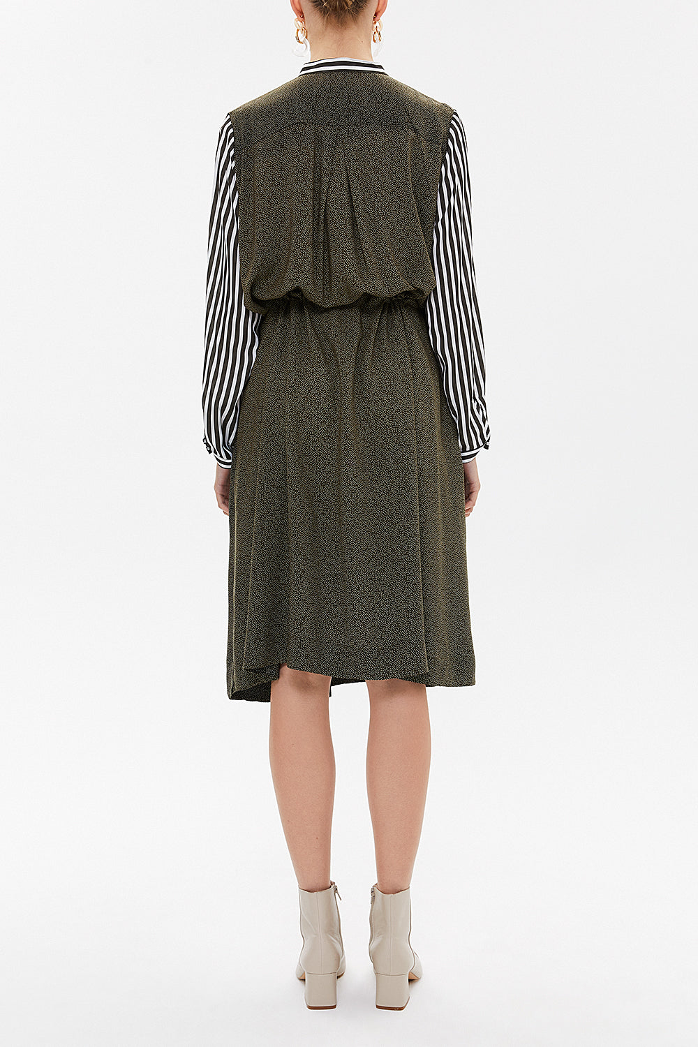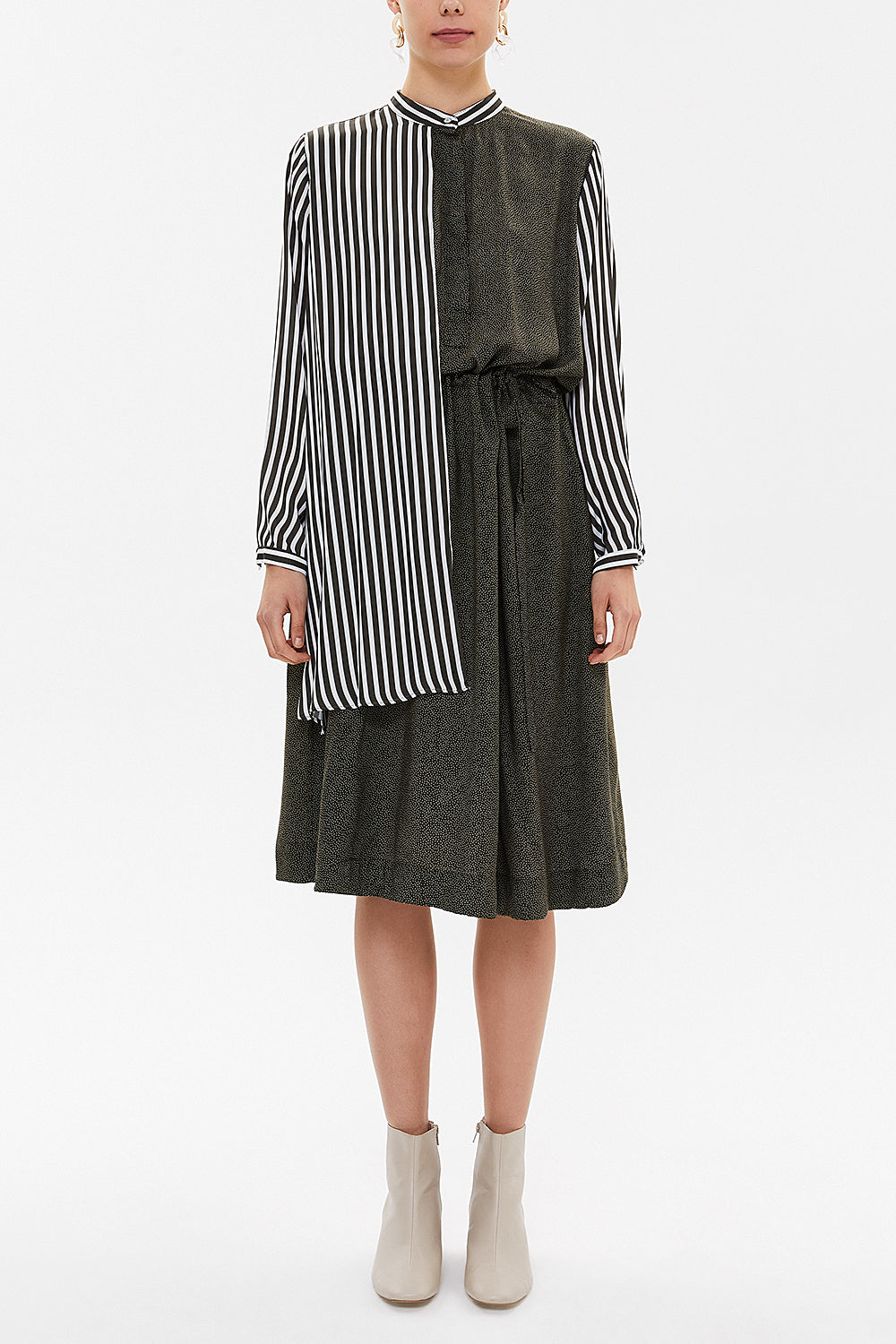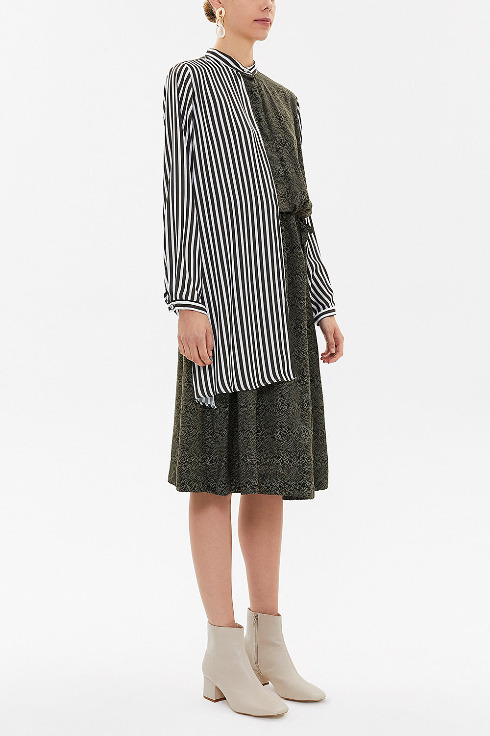 Haki çizgilii kumaş kombinli düğmeli midi elbise 92805