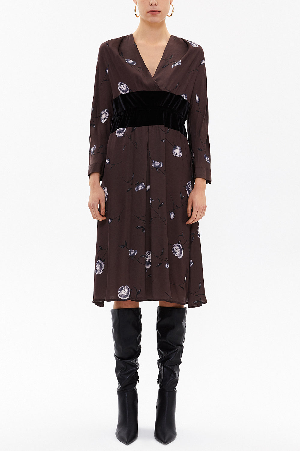 Kahve V yaka kadife kumaş kombinli midi elbise 92485