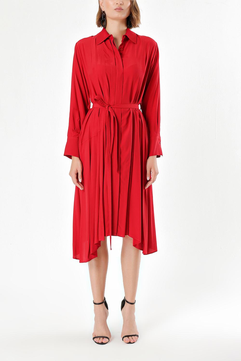 Kırmızı Bol kesim pili detaylı gömlek elbise 93828