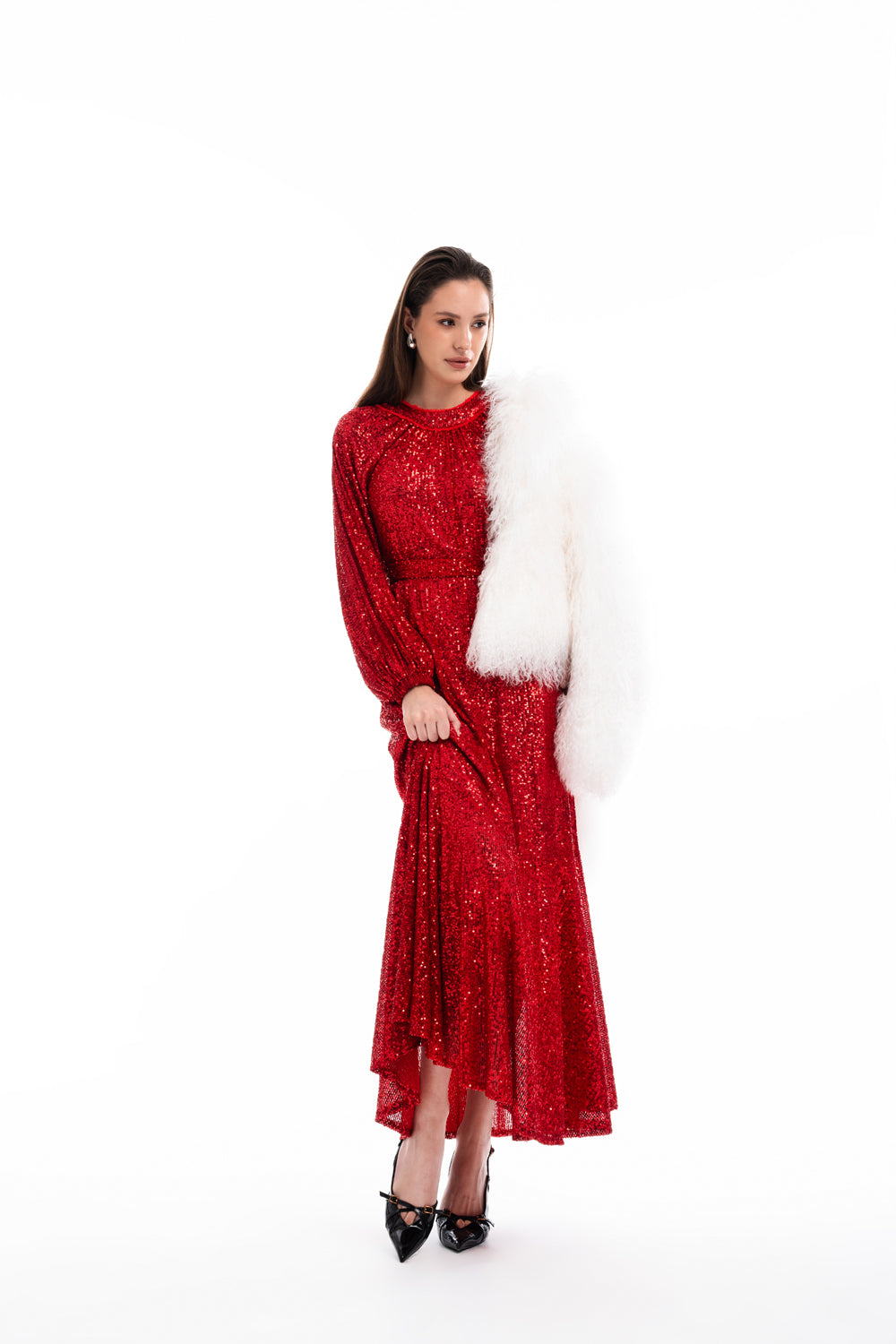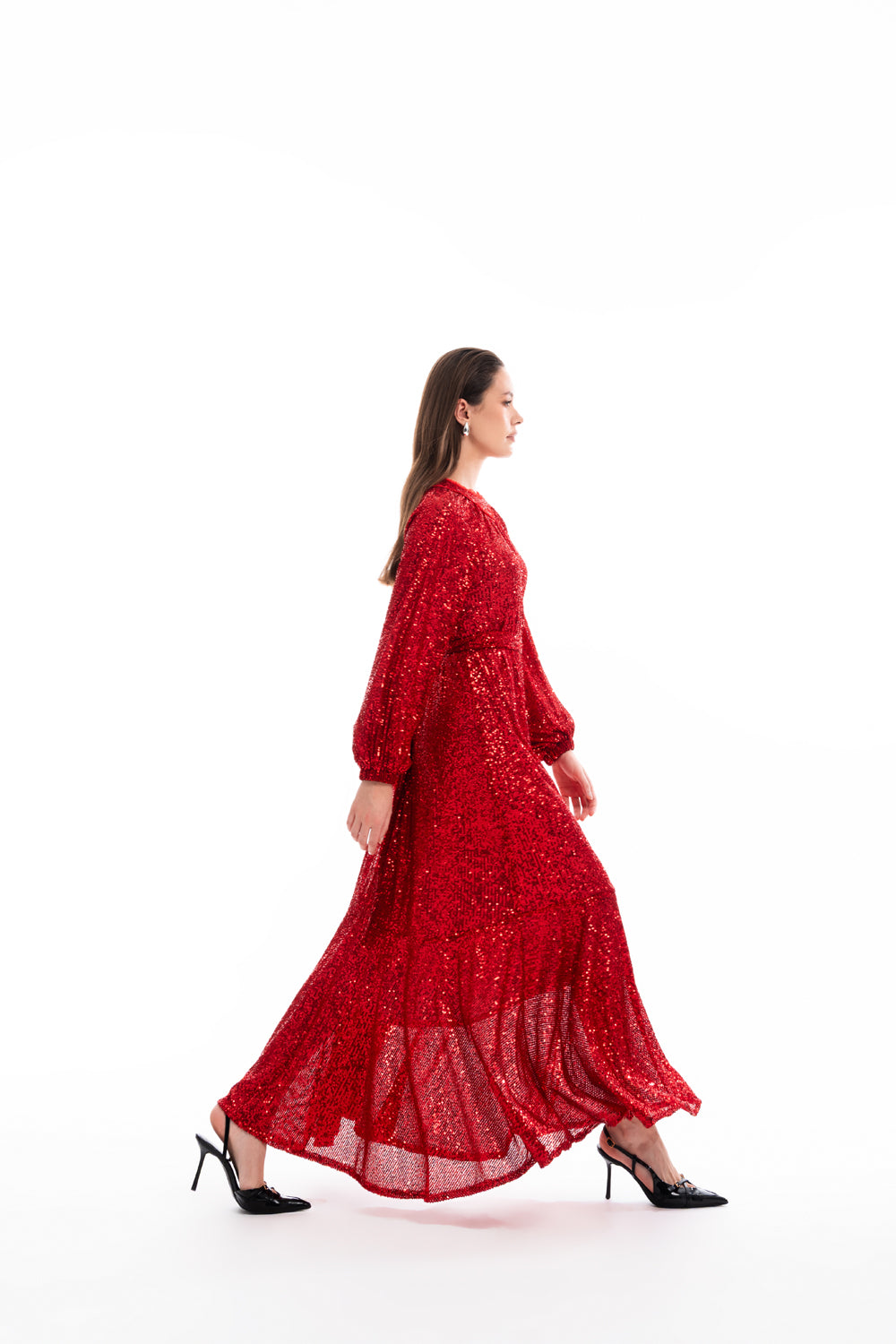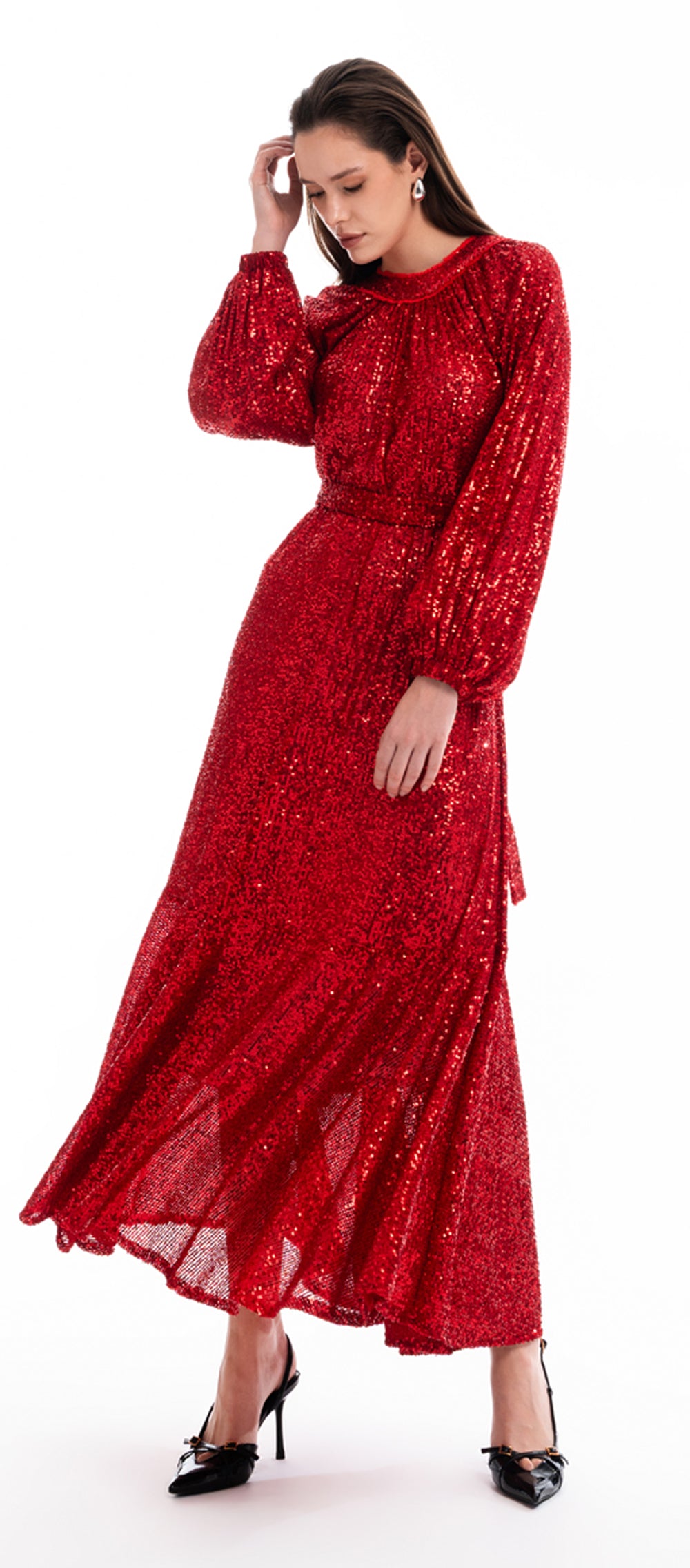 Kırmızı Büzgü detaylı balon kollu payetli elbise 94468