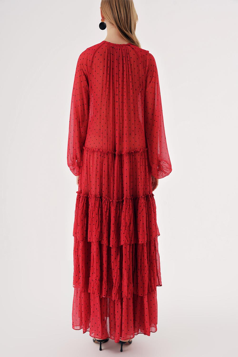 Kırmızı Büzgülü rahat kesim kemerli uzun elbise 94515