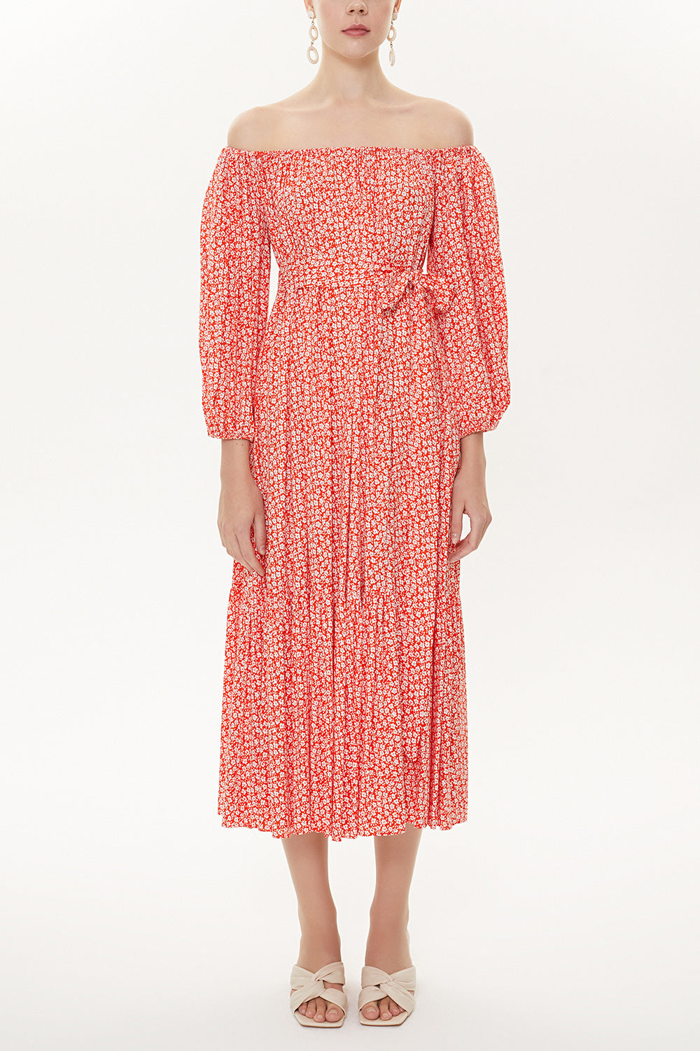 Kırmızı Kayık yaka balon kollu elbise 93421