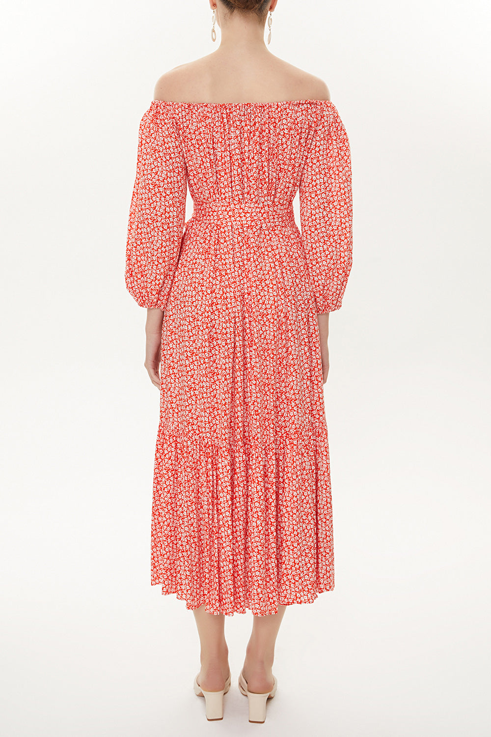 Kırmızı Kayık yaka balon kollu elbise 93421