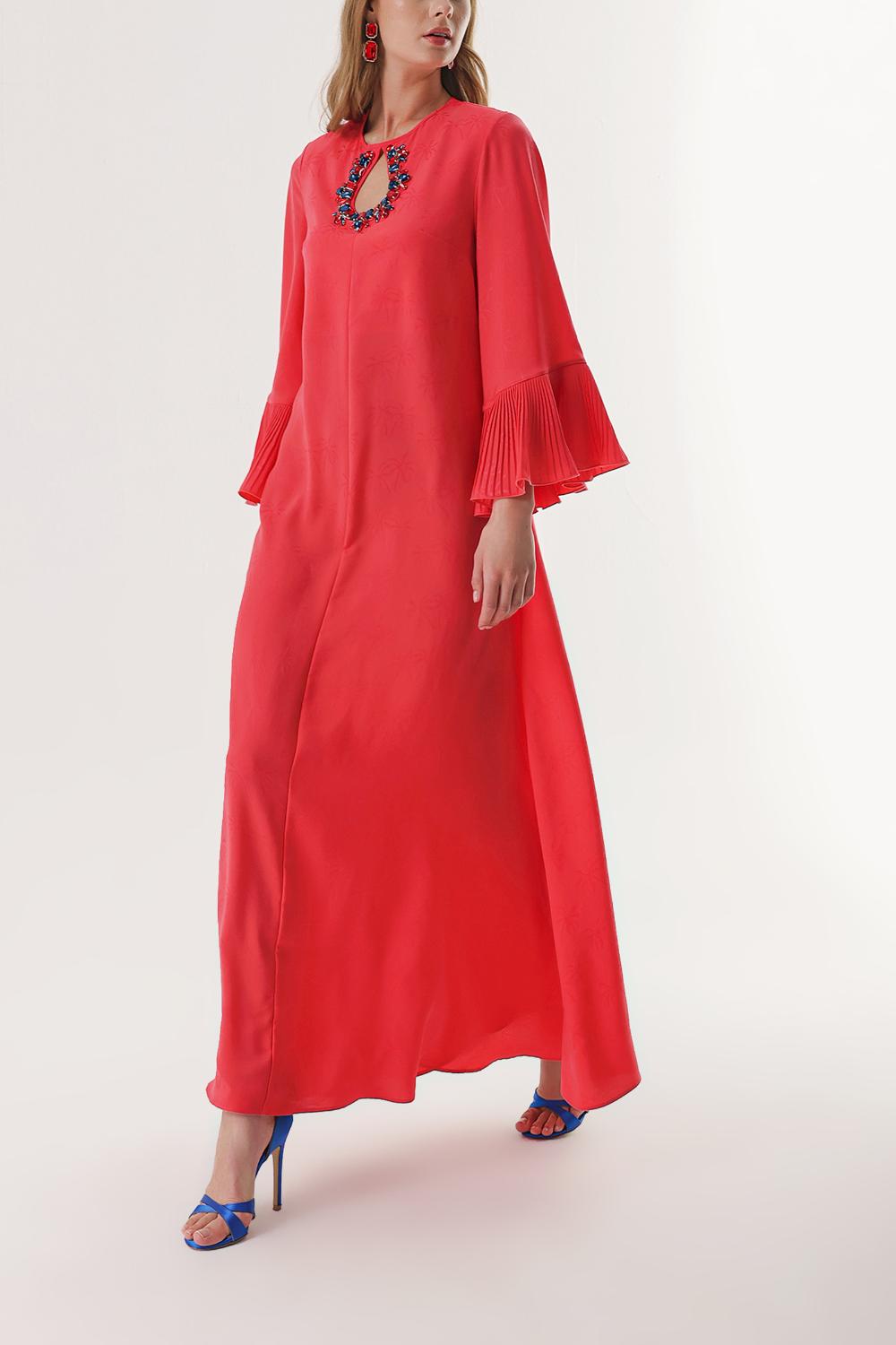 Kırmızı Kolları plise detaylı kristal taş işlemeli uzun elbise 94209