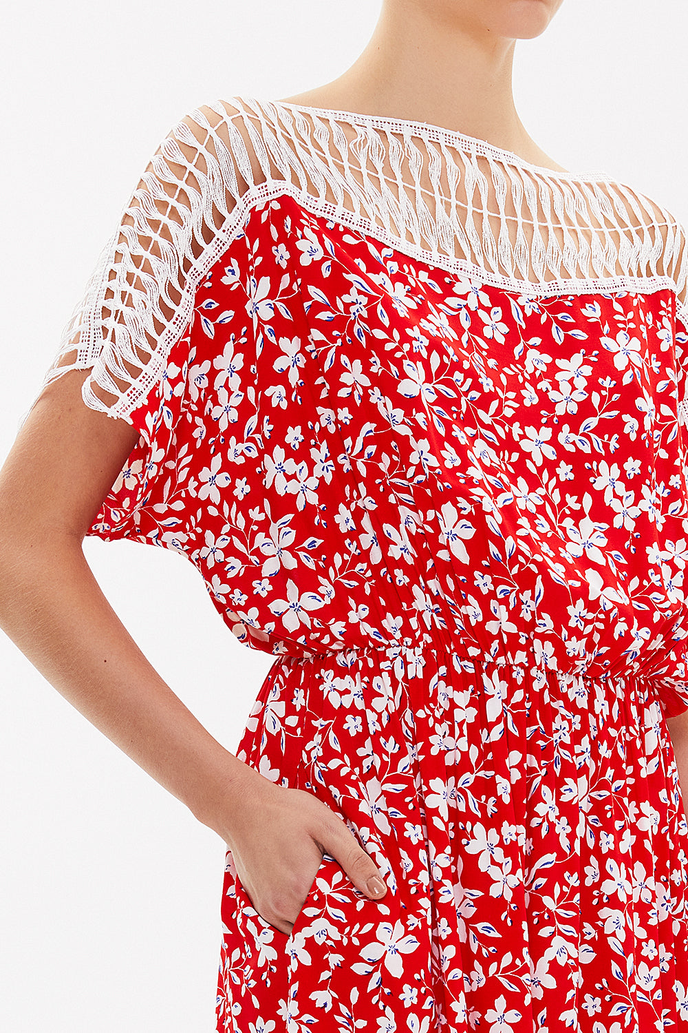 Kırmızı Yakası dantelli kuşaklı uzun elbise 93205