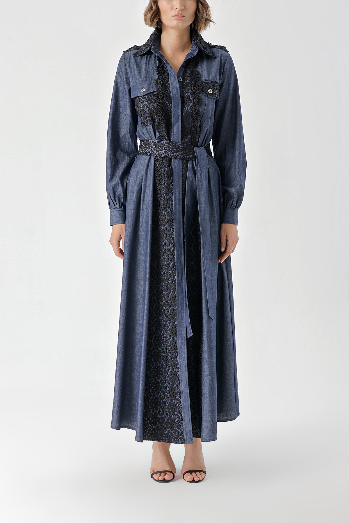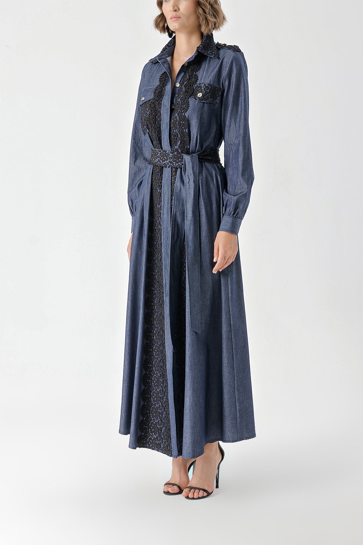 Lacivert Düğme ve dantel detaylı uzun denim elbise 94326