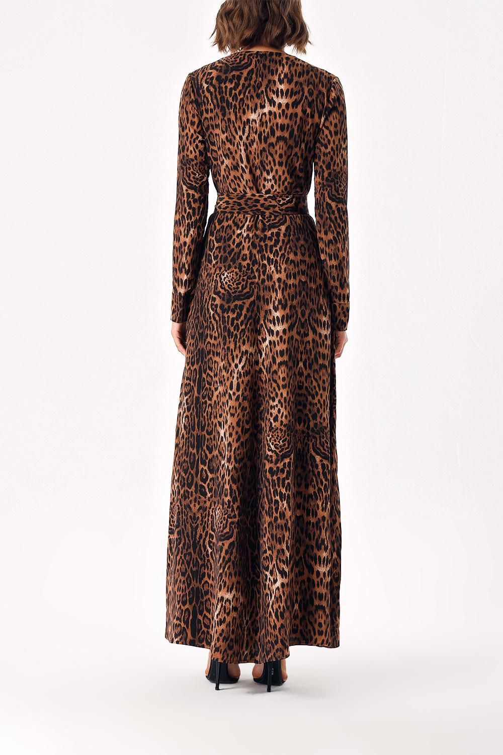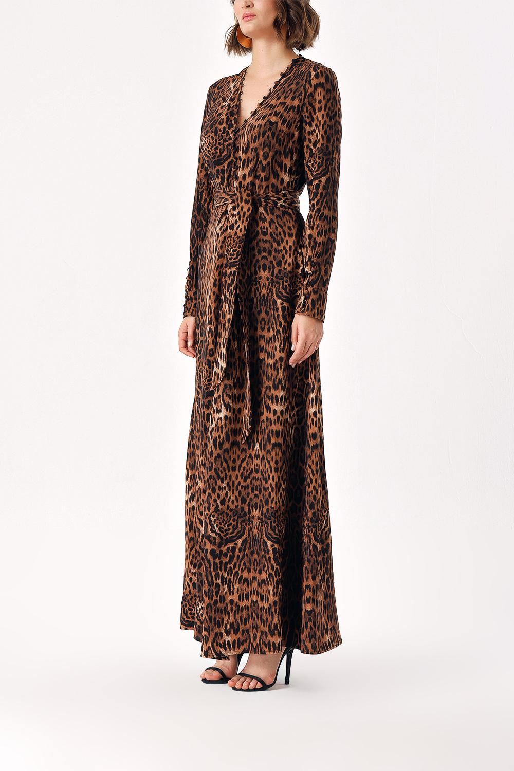 Leopar Düğme detaylı uzun kemerli elbise 94407