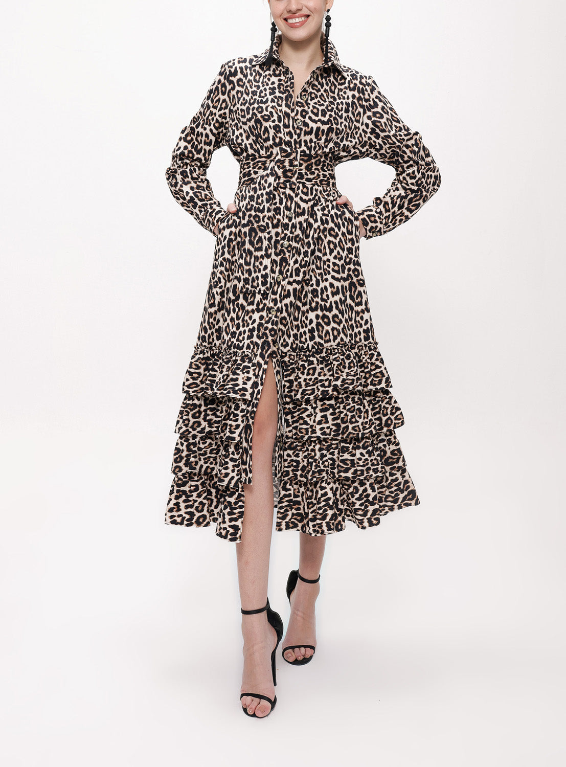 Leopar Fırfırlı uzun gömlek elbise 93979