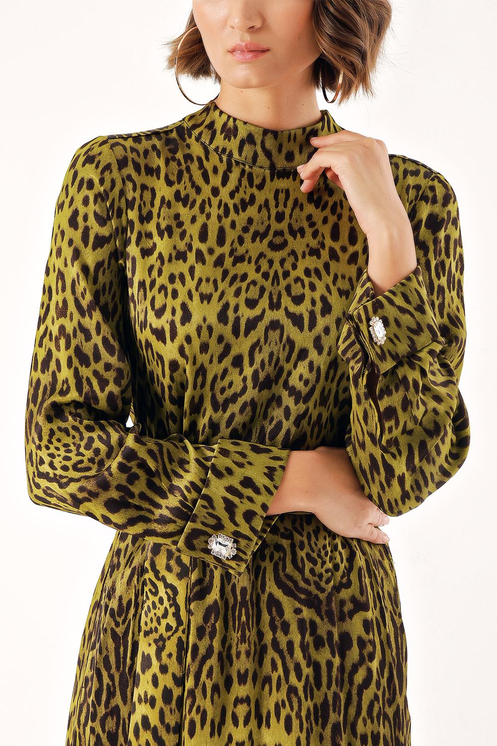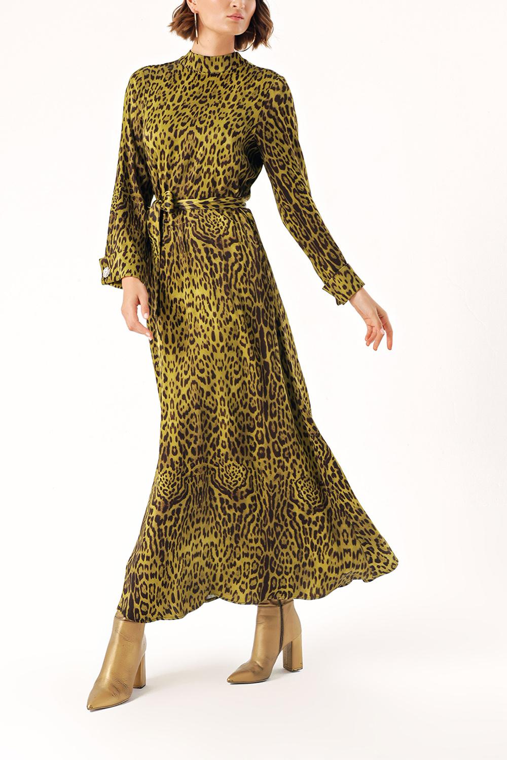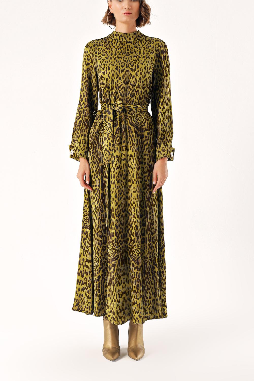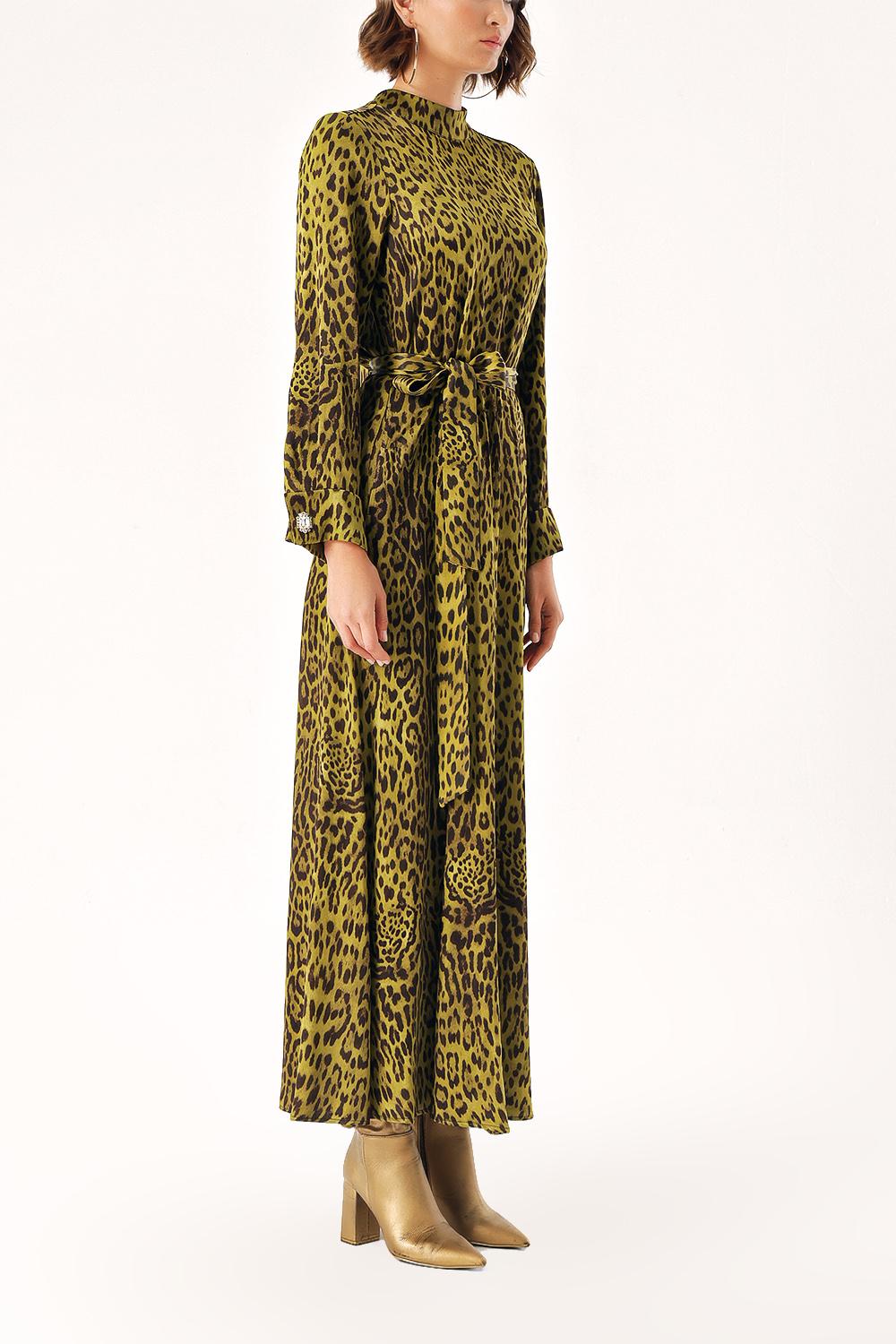 Leopar-Olive Uzun kemerli viskon elbise 94355