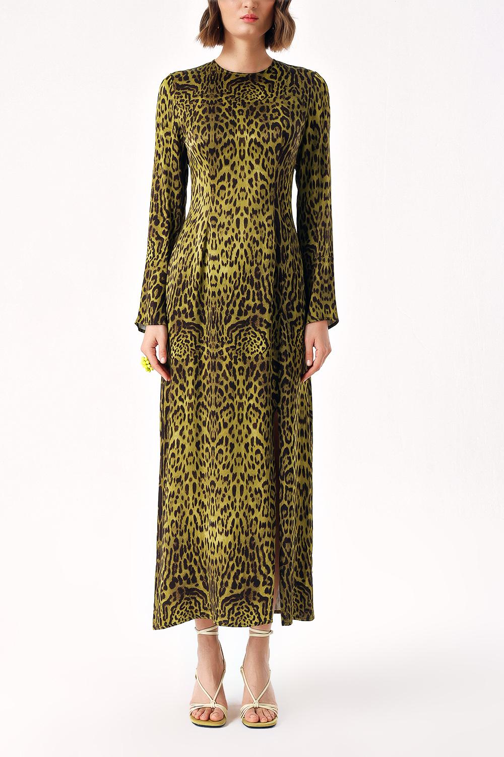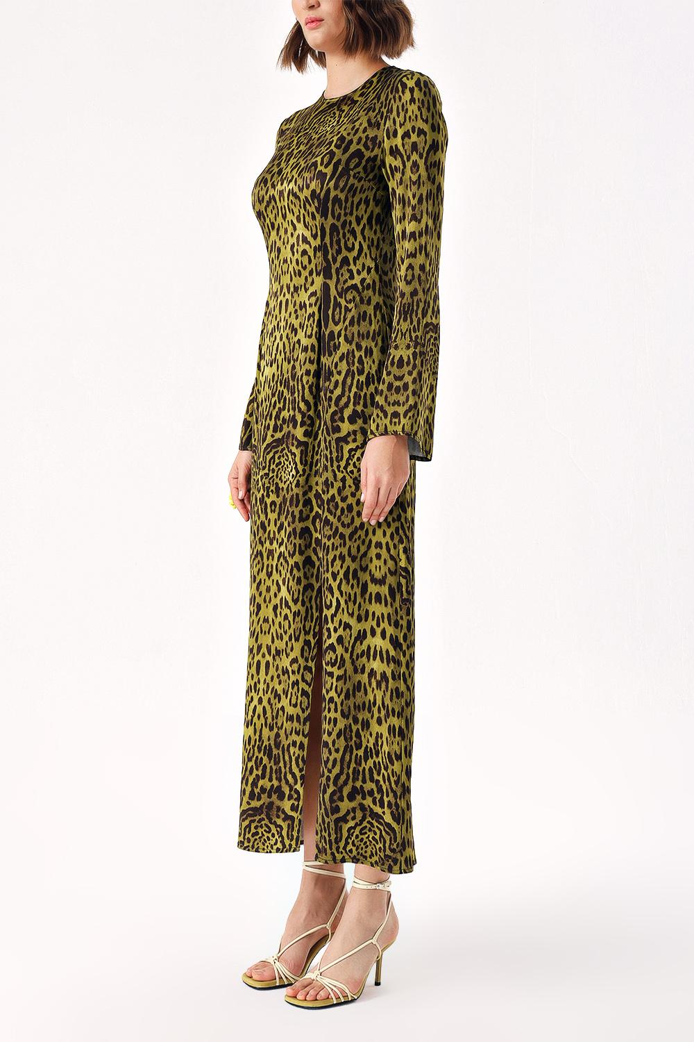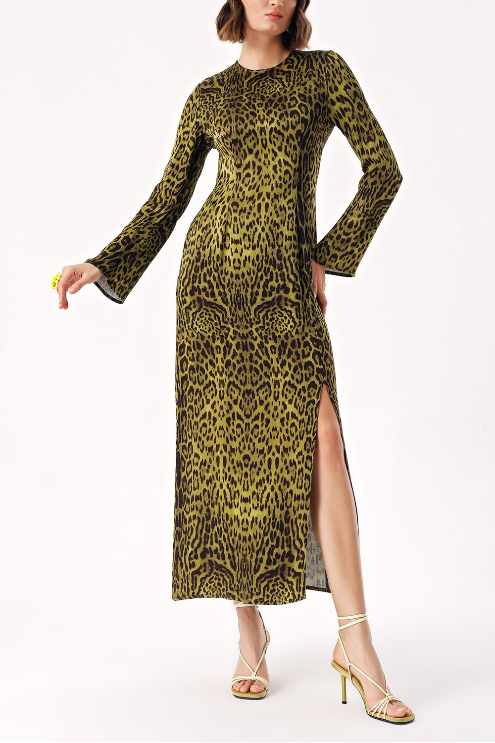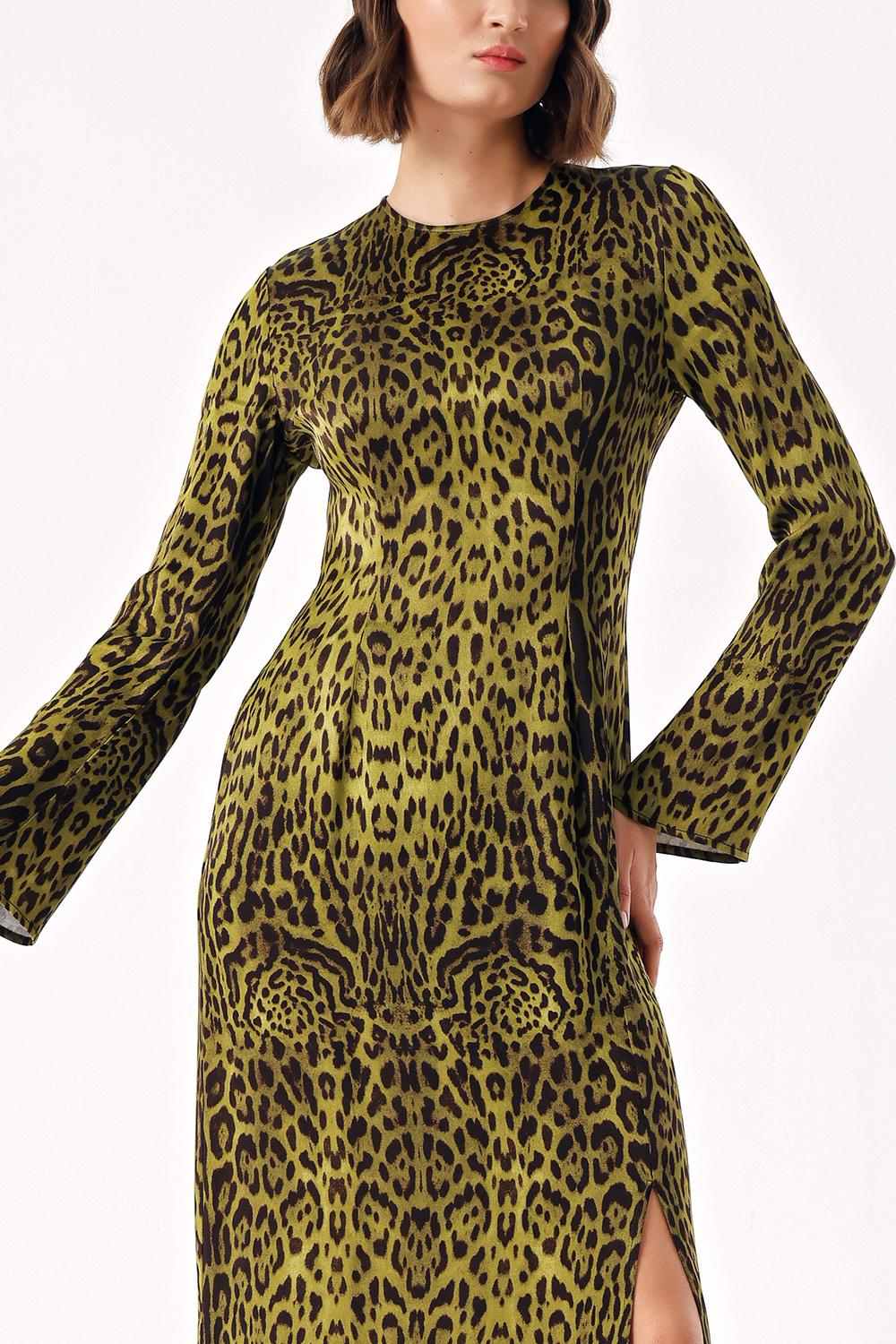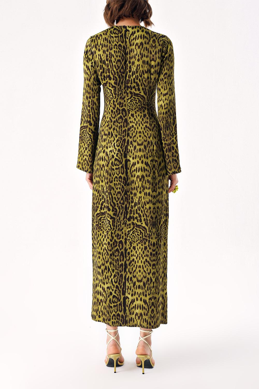 Leopar-Olive Uzun vücuda oturan yırtmaç detaylı elbise 94379