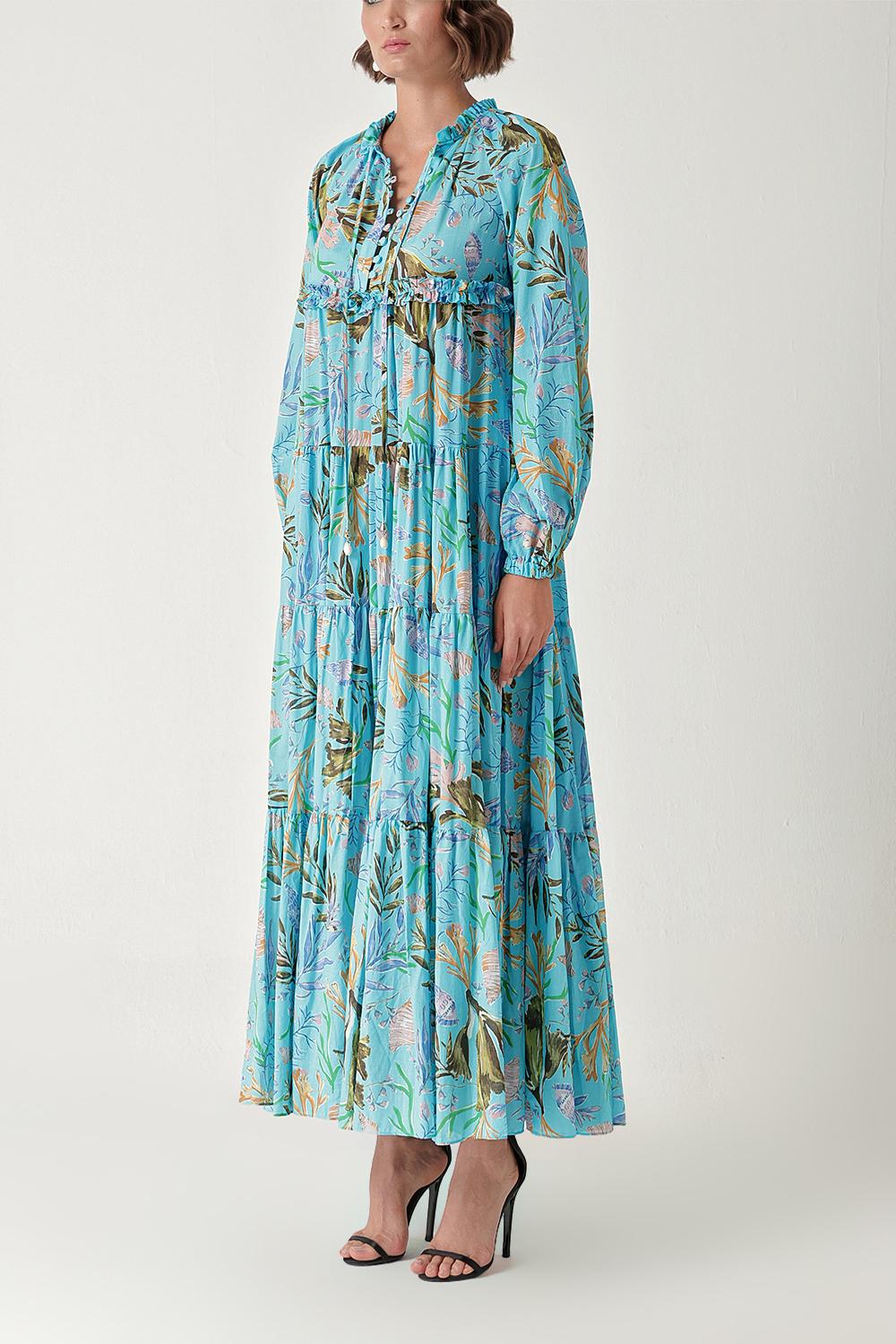 Mavi Büzgülü aksesuar detaylı uzun elbise 94346