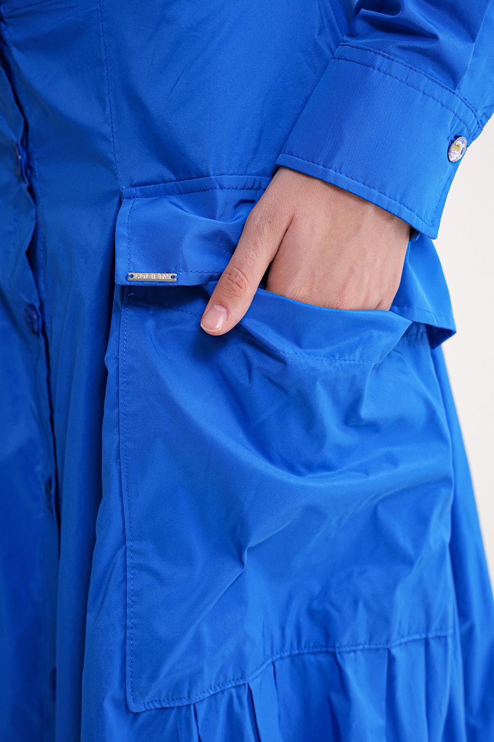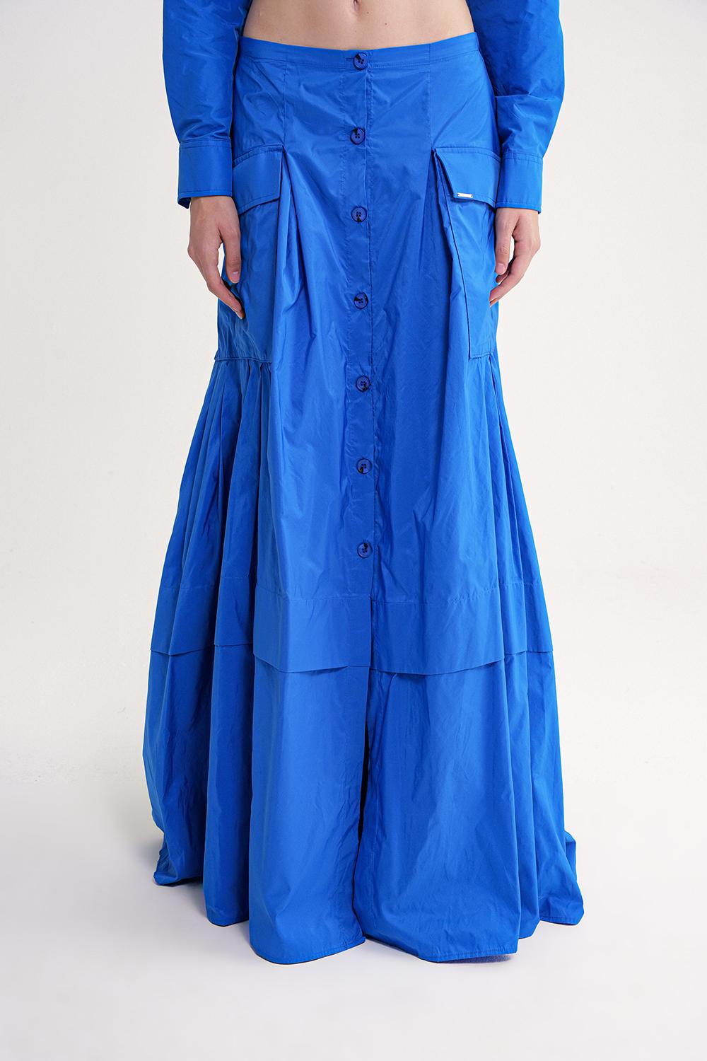 Ürün Özellikleri: Önü düğmeli, büyük cepli ve büzgü detaylı bu A kesim etek, hafif ve tok duruşlu kumaşıyla gün boyu formunu korur.