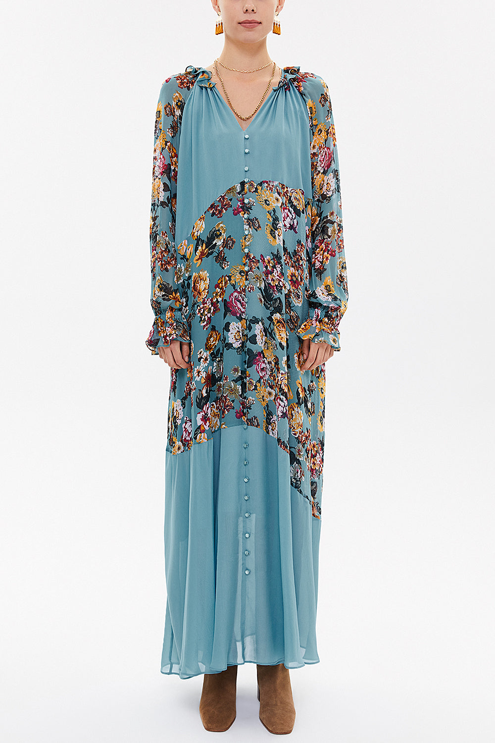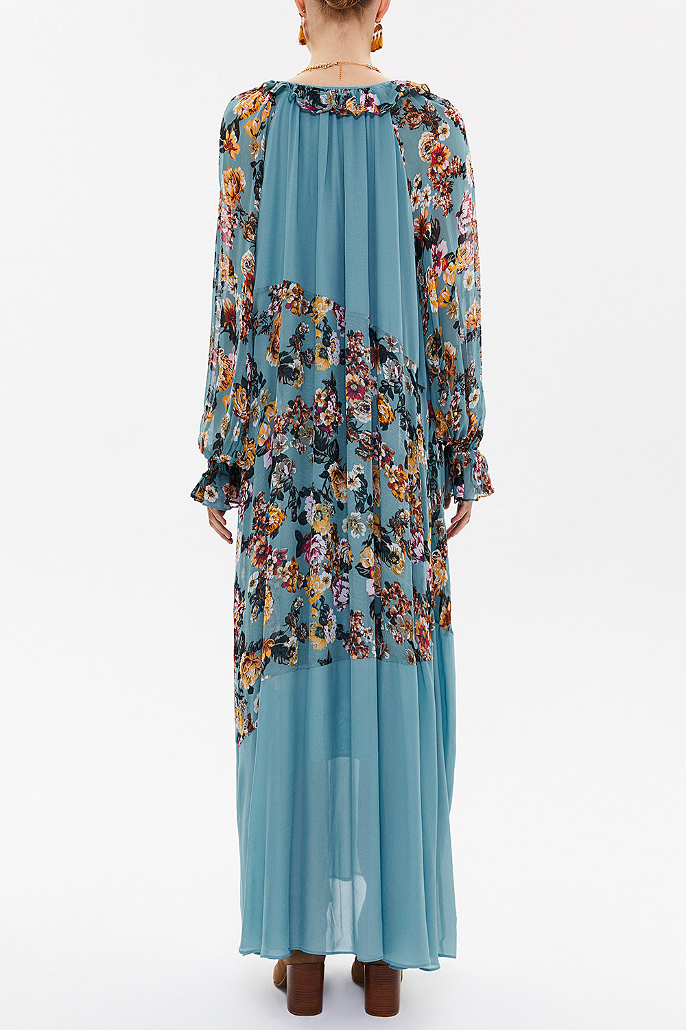 Mavi Desenli Fırfırlı uzun elbise 93315