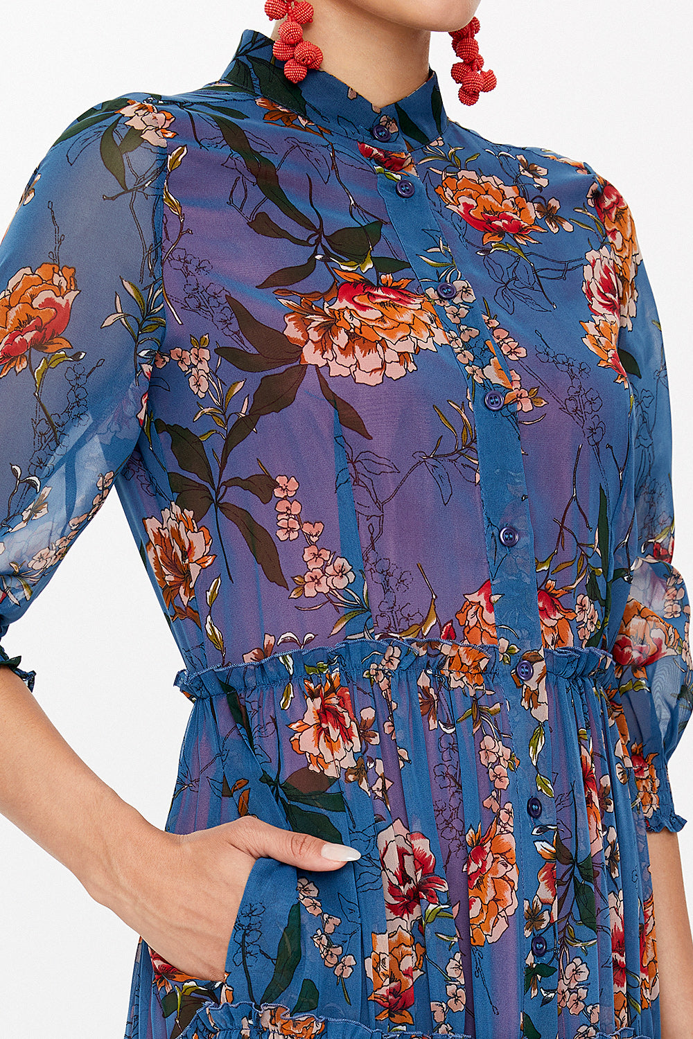 Mavi Kolları lastikli büzgülü uzun elbise 93164