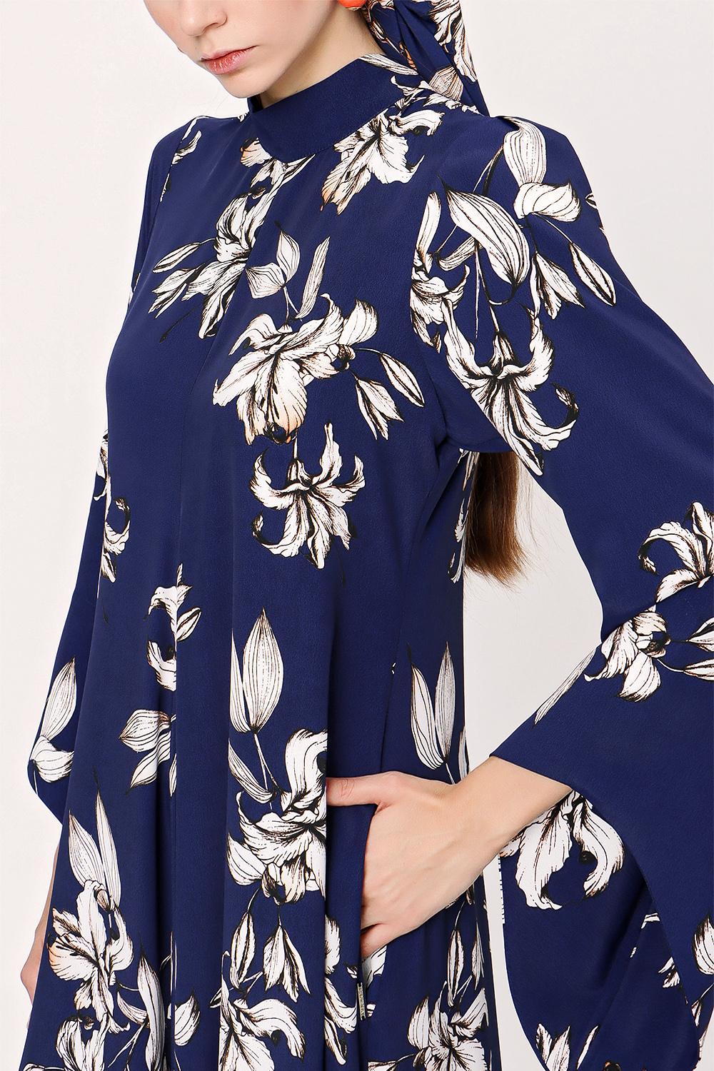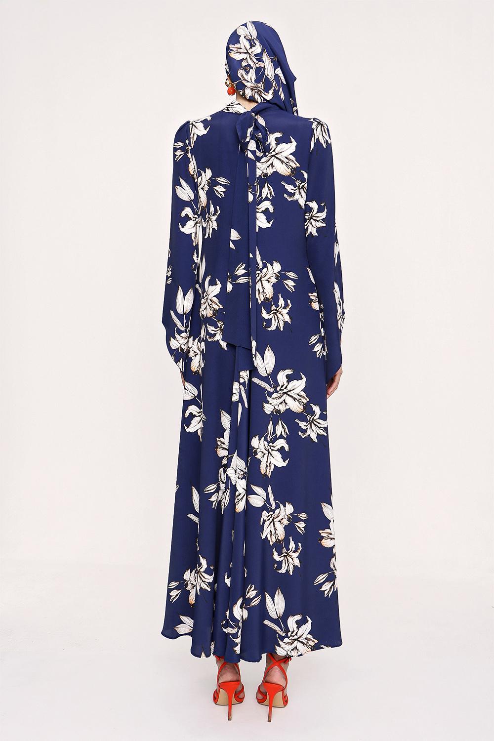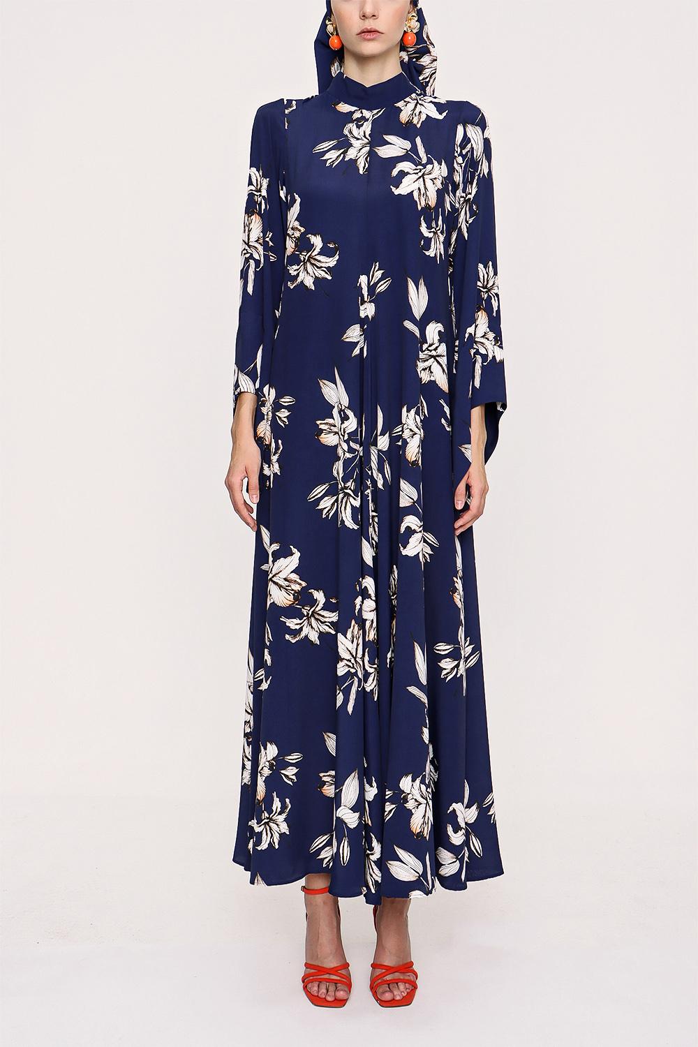 Mavi Yüksek yaka bol kesim uzun elbise 94025