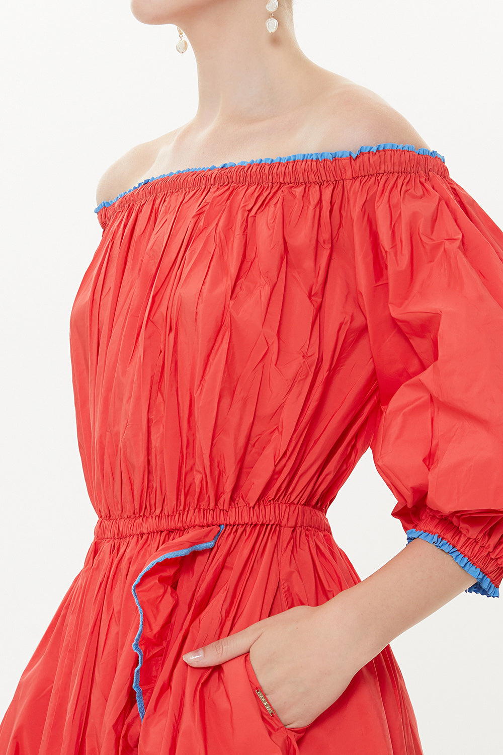 Mercan Balon kollu omuzu lastikli etegi büzgülü uzun elbise 93398