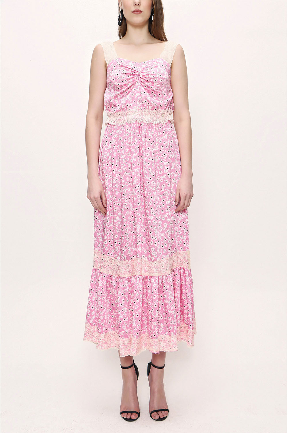 Ürün Özellikleri: omantik çiçek deseni ve zarif dantel detaylarıyla dikkat çeken askılı elbise, yaz aylarında ferah ve feminen bir görünüm sunar. Günlük ve özel gün kombinleri için idealdir.