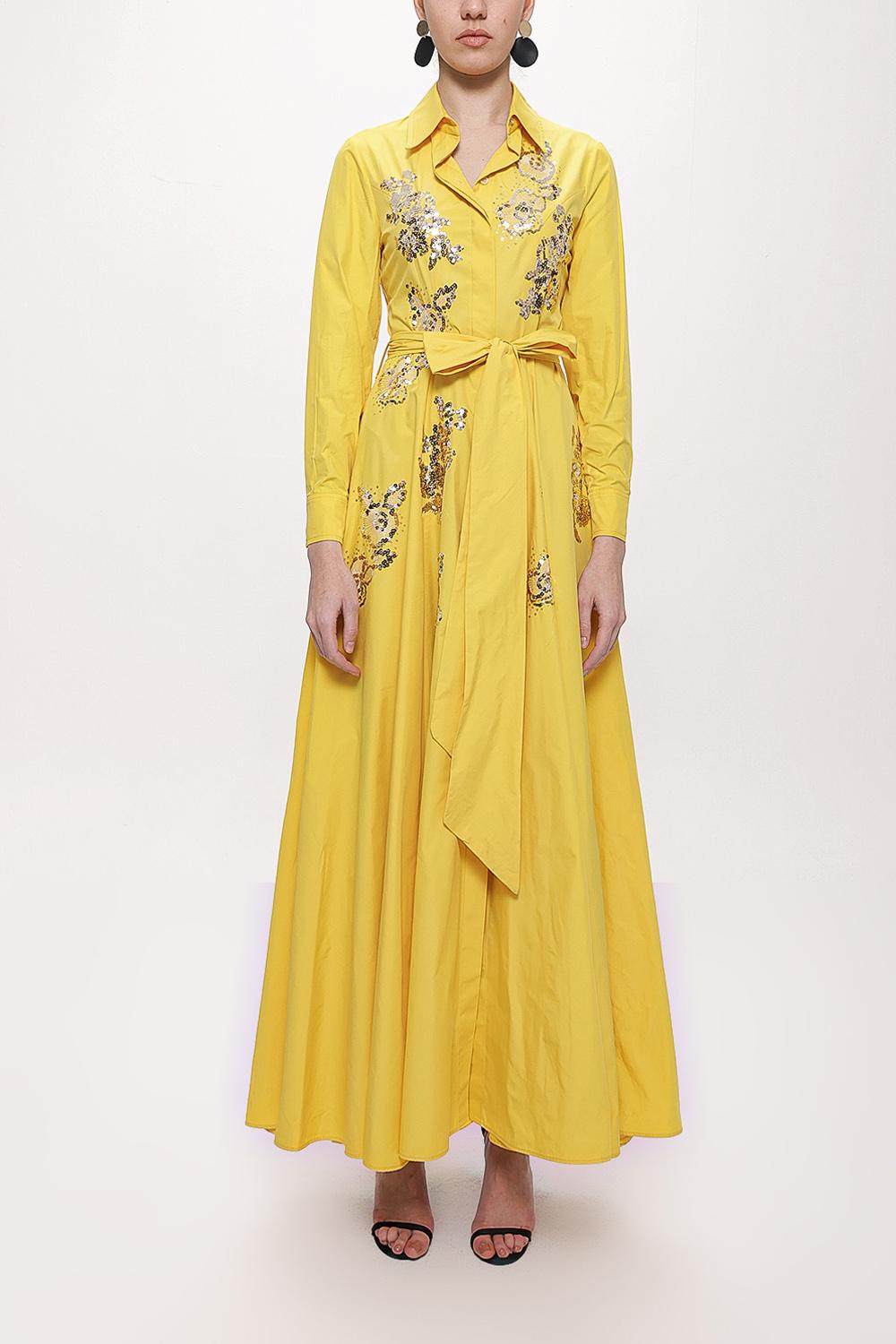 Sarı Payet nakışlı uzun tafta gömlek elbise 94159