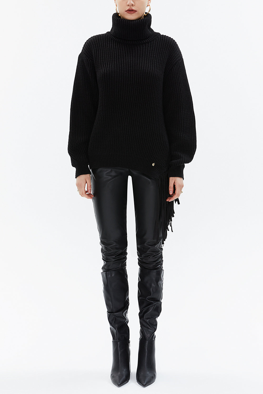 Siyah Balıkçı yaka püskül detaylı triko kazak 19816