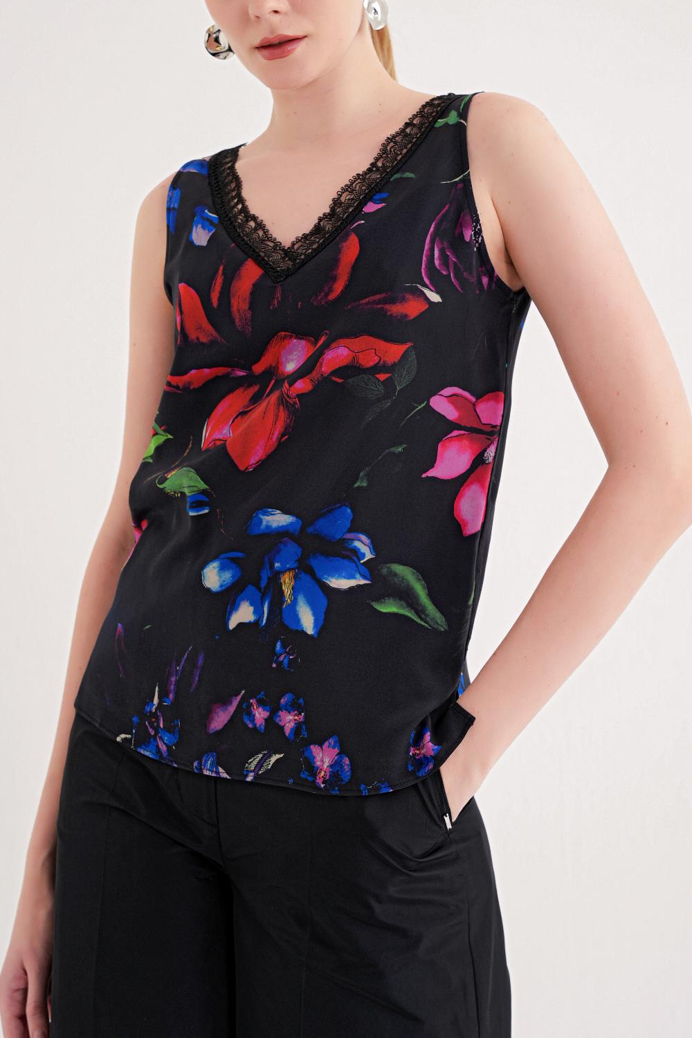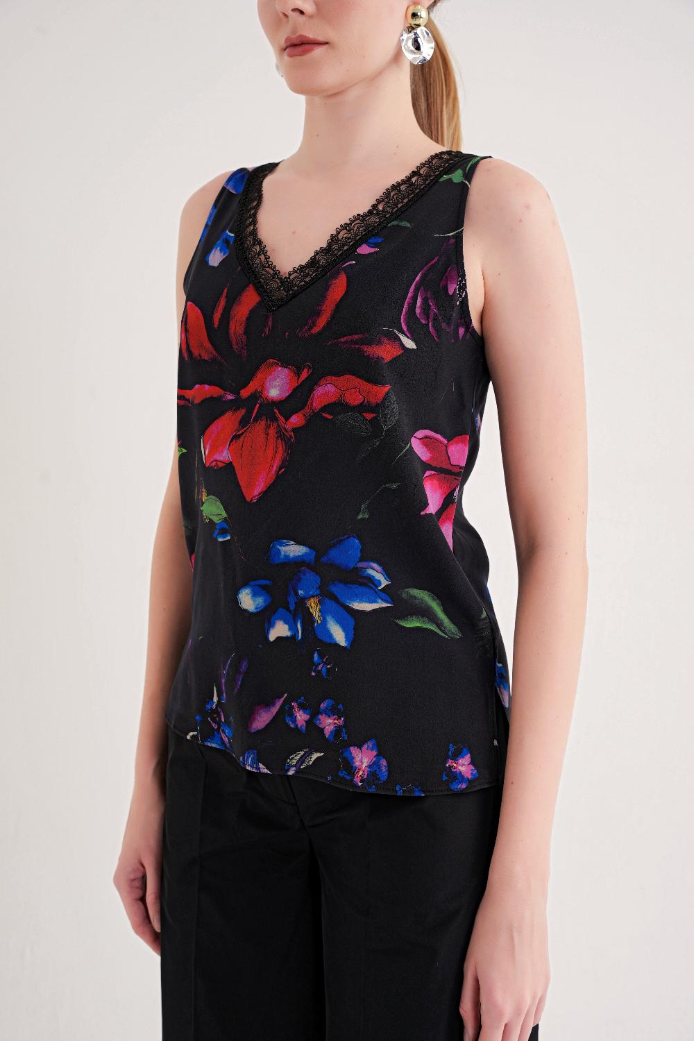 Siyah Baskı DANTEL DEYATLI V YAKA İPEK BLUZ 19479