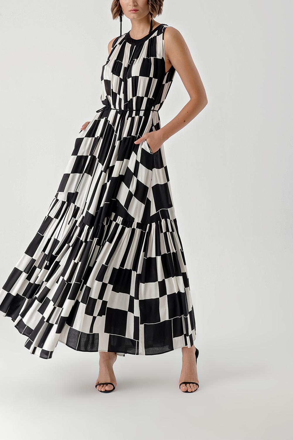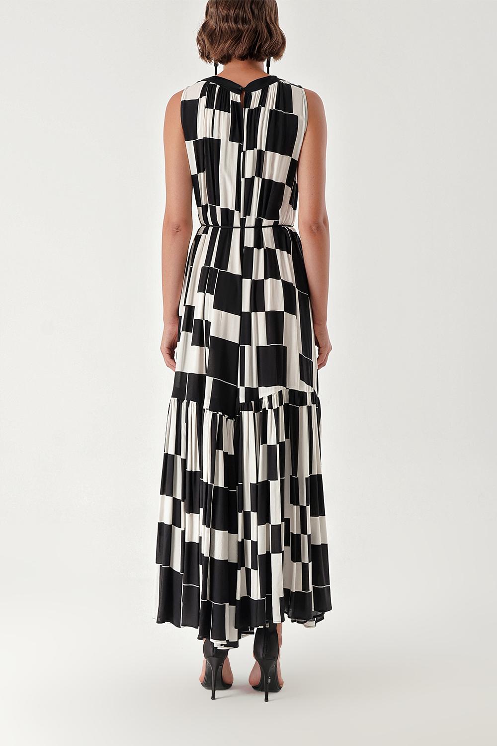 Siyah Beyaz Kolsuz büzgülü uzun elbise 94263