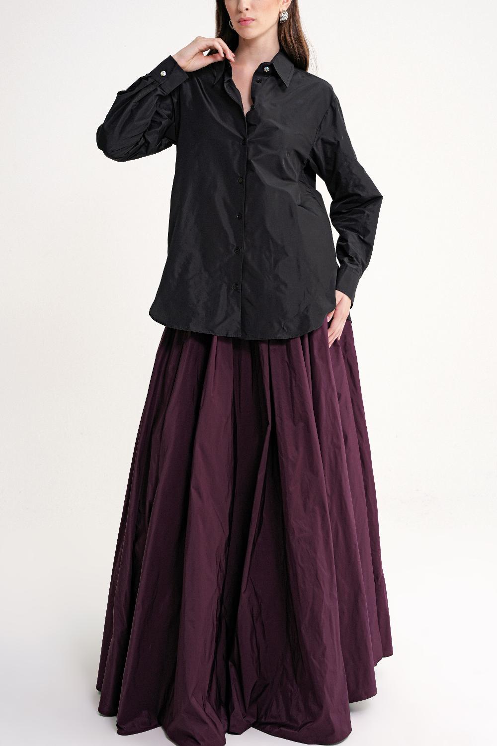 Ürün Özellikleri: Işıltılı ve tok yapısıyla dikkat çeken tafta kumaştan üretilen bu gömlek, şıklığı ve hacimli duruşu bir arada sunar. Uzun ve rahat kesimiyle modern, iddialı bir görünüm kazandırır.