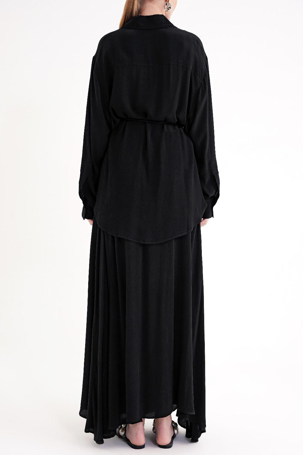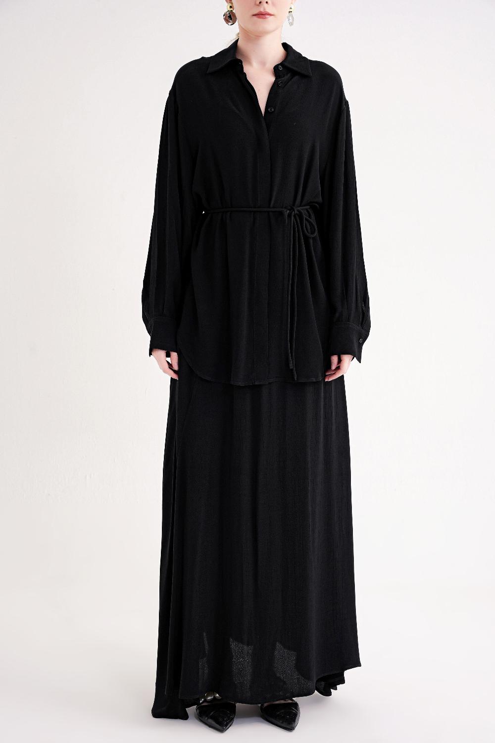 Siyah Bol kesim gömlek ve lastik detaylı etekli takım 12382