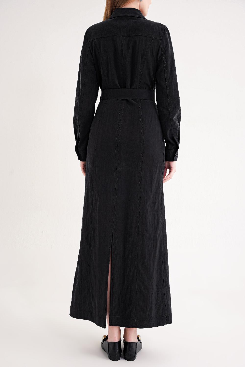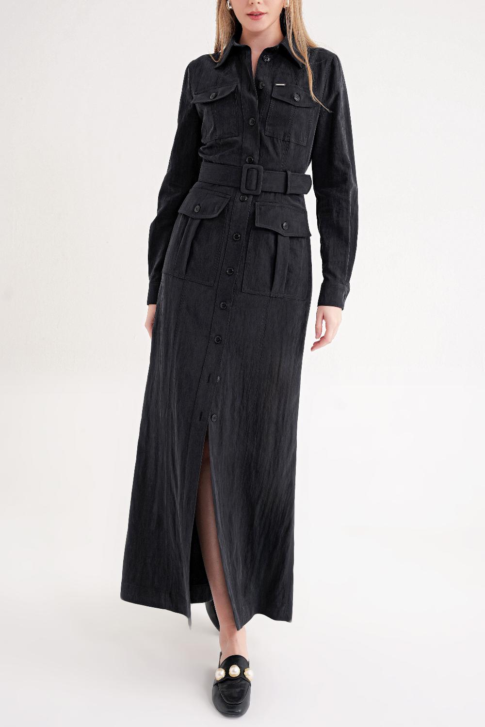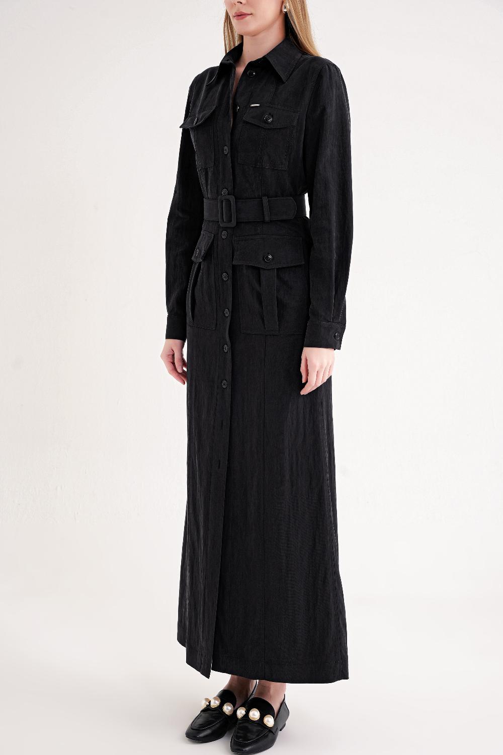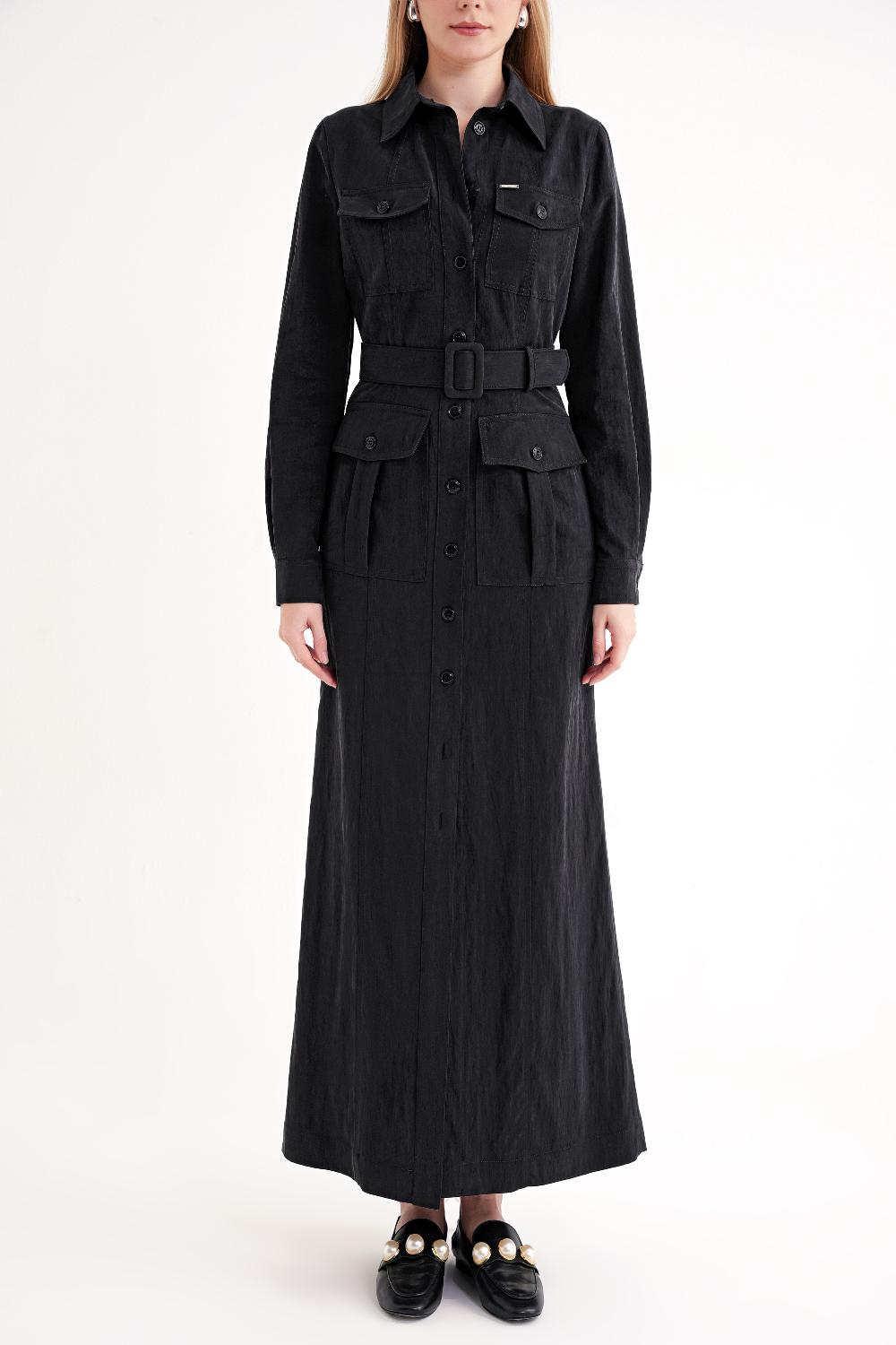 Ürün Özellikleri: Gömlek yaka tasarımı ve belde kemer detayıyla güçlü bir duruş sunan bu elbise, cep ve düğme detaylarıyla tamamlanır. Dengeli kesimi sayesinde şık ve düzenli bir görünüm sağlar.