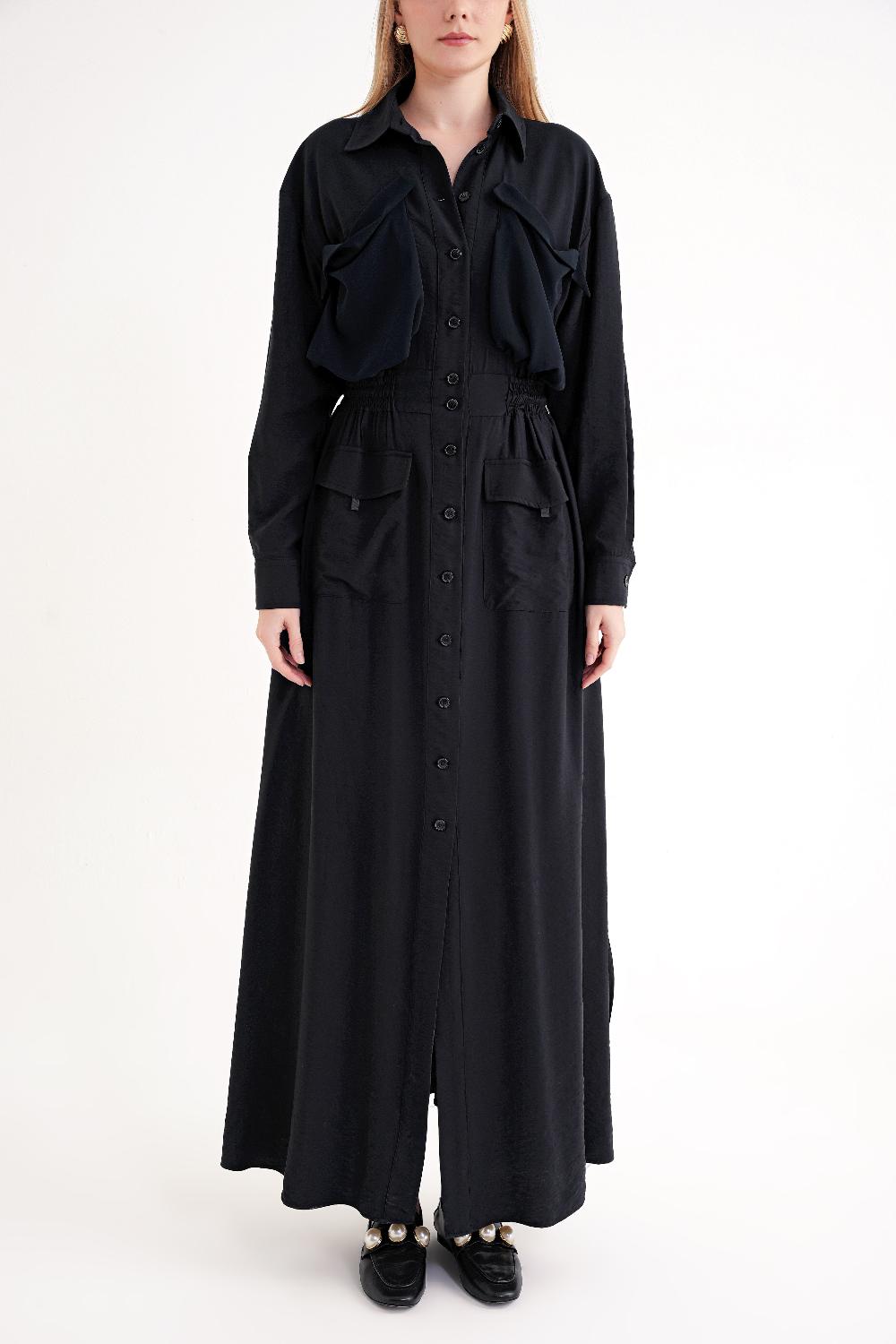 Siyah Cep ve lastikli bel detaylı uzun elbise 94661