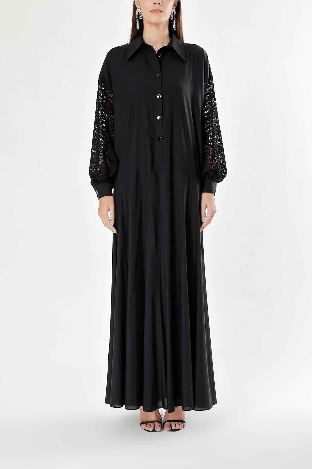Ürün Özellikleri: Zarafeti ve sadeliği bir araya getiren bu uzun elbise, gömlek yaka tasarımı ve önden düğme kapamasıyla modern bir şıklık sunar. Kollarında ince dantel detaylar ise feminen bir dokunuş kazandırır.