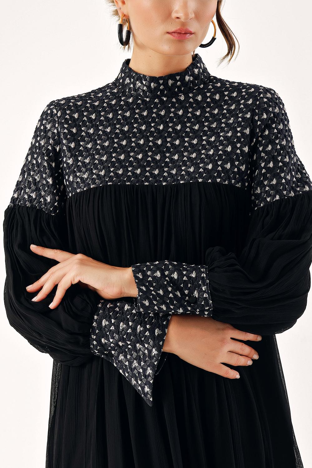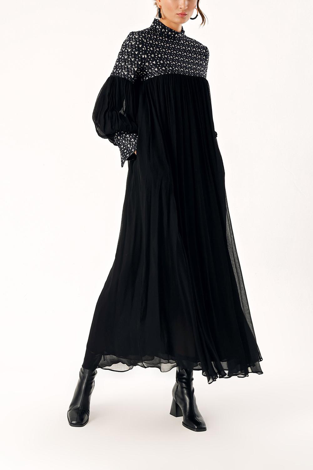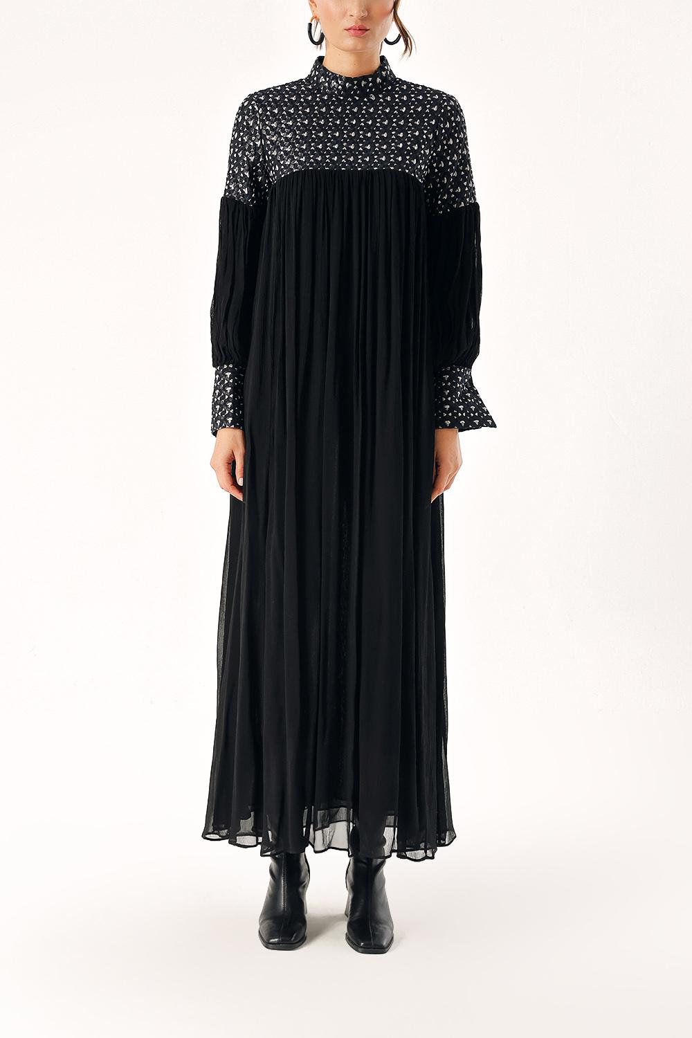 Siyah Garni detaylı büzgülü uzun elbise 94338