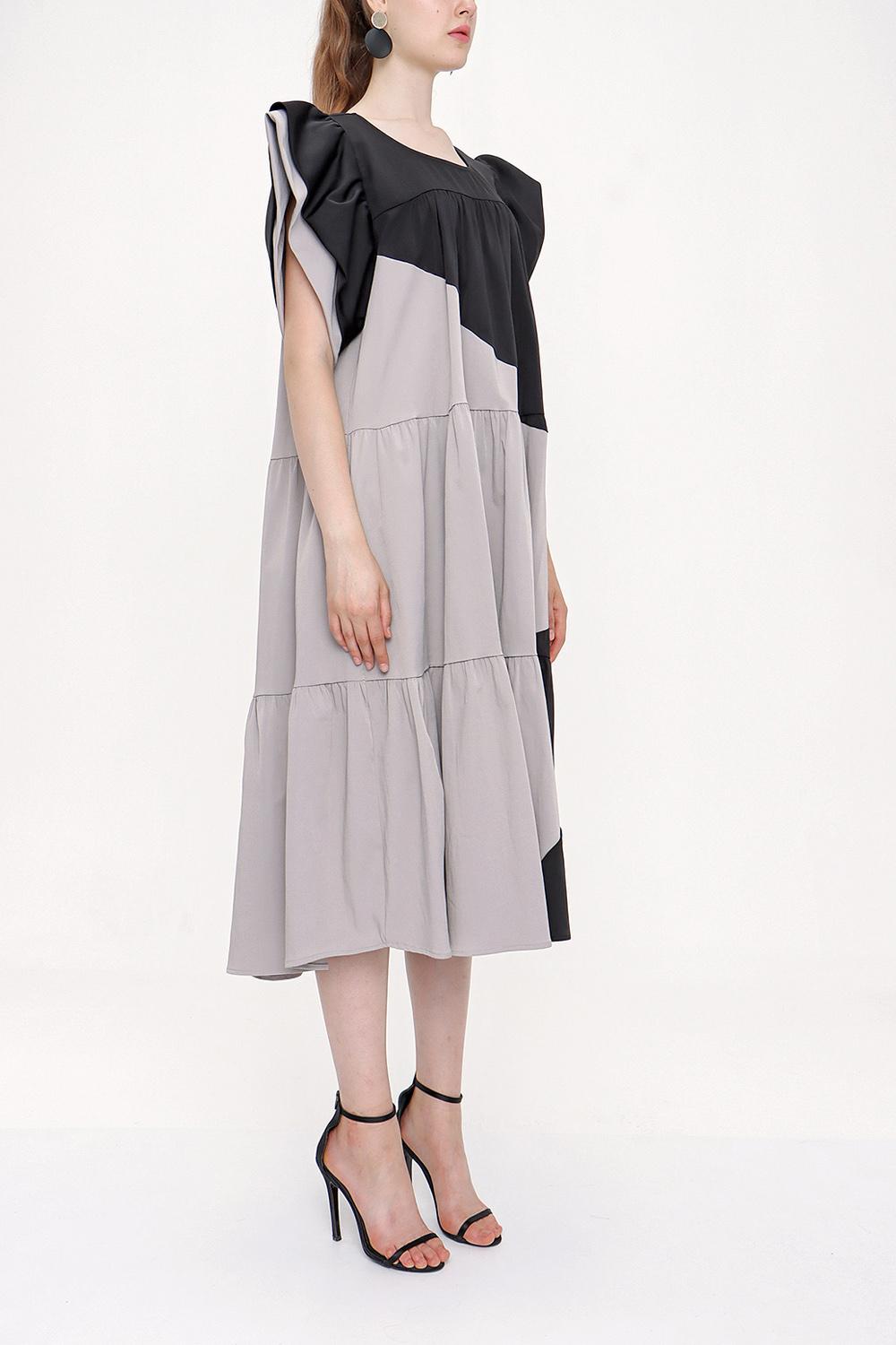 Siyah Gri Kontrast renkli büzgülü elbise 93944