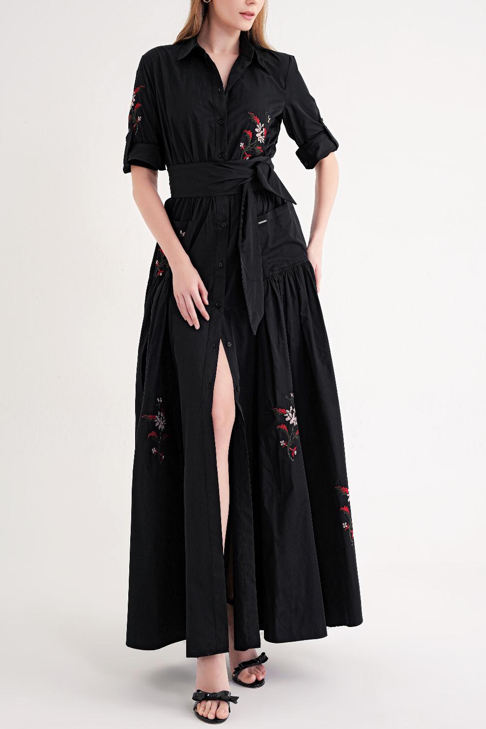 Ürün Özellikleri: Nakış detaylarıyla hareket kazanan, belden bağlamalı kuşak ve cepli tasarımıyla öne çıkan uzun elbise. Gömlek yaka formu sayesinde hem günlük hem de şık kombinlere uyum sağlar.