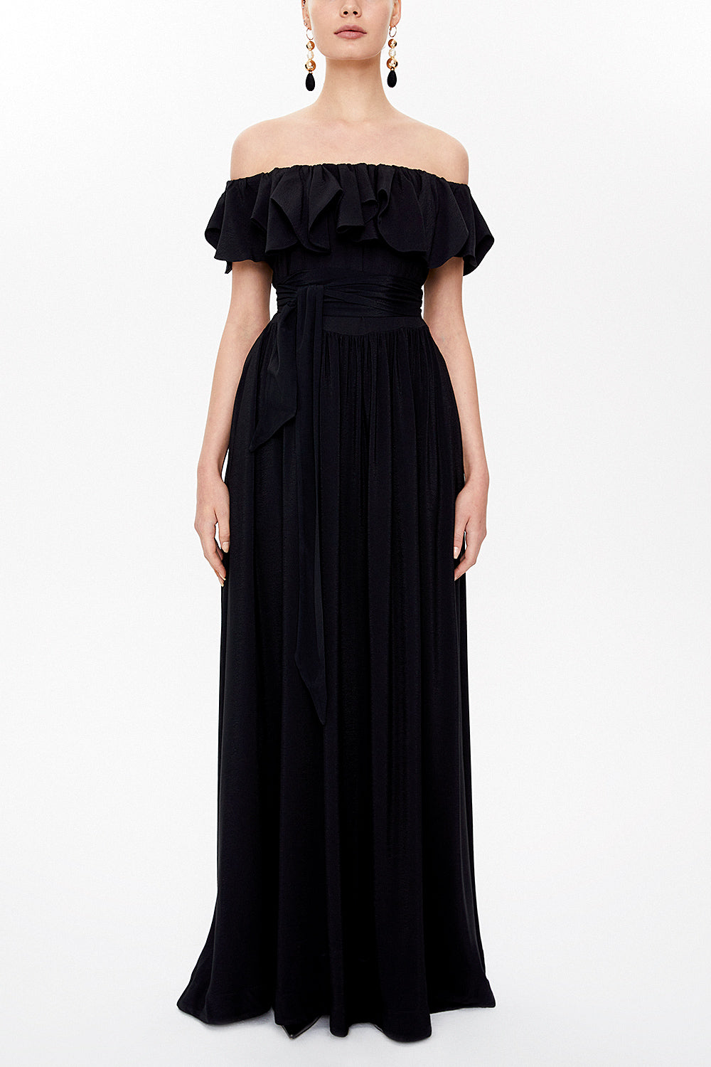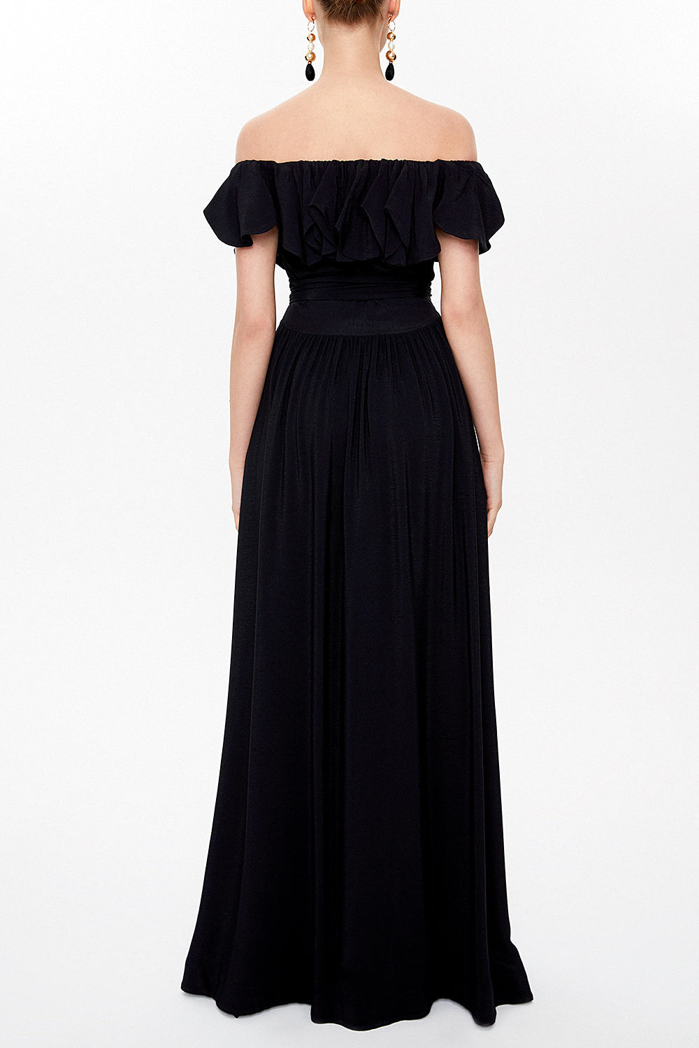 Siyah Önü fırfırlı düşük omuzlu uzun elbise 93005