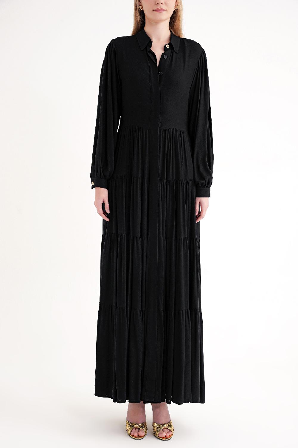 Siyah Siyah balon kol büzgülü gömlek elbise 94686
